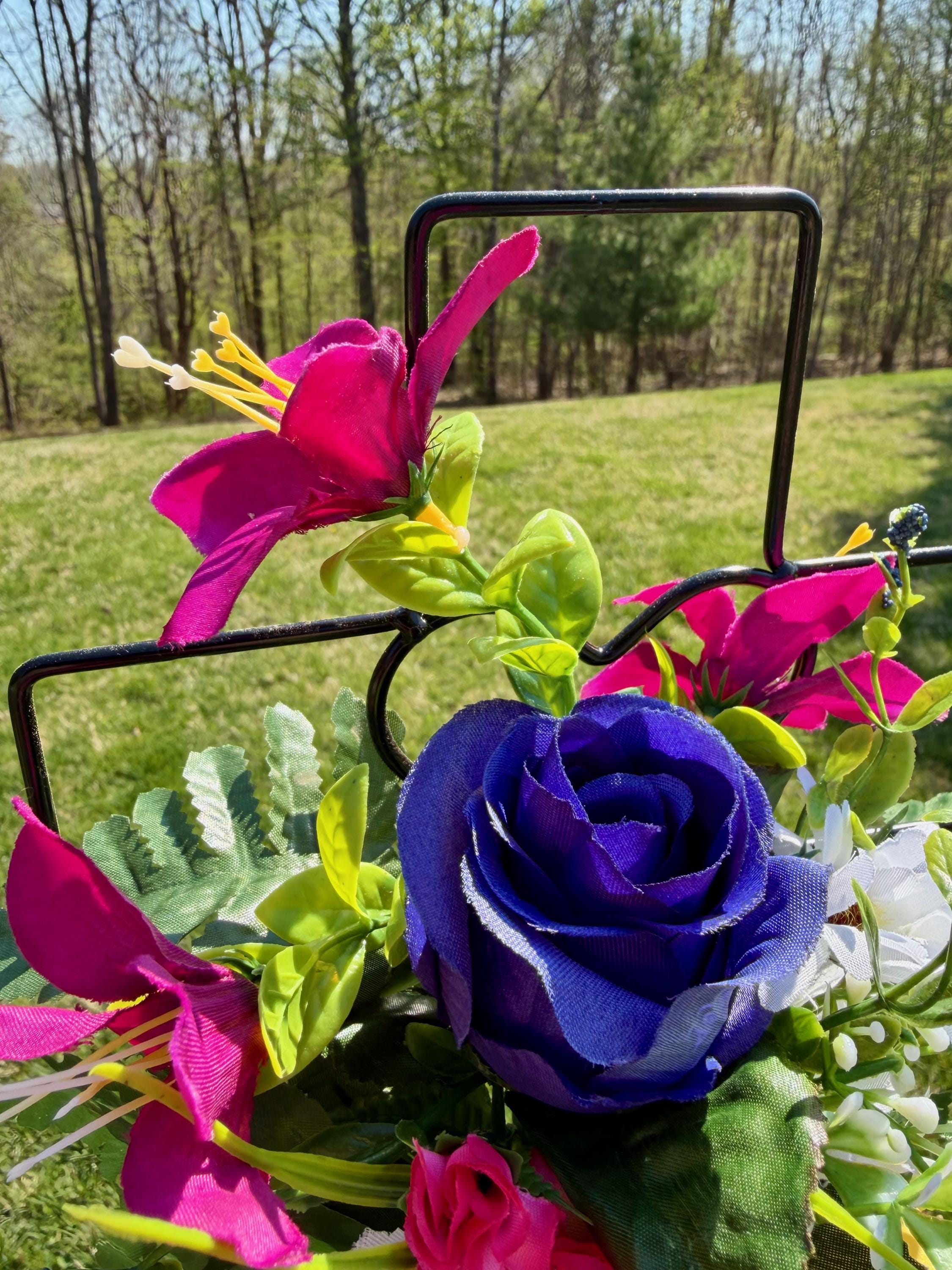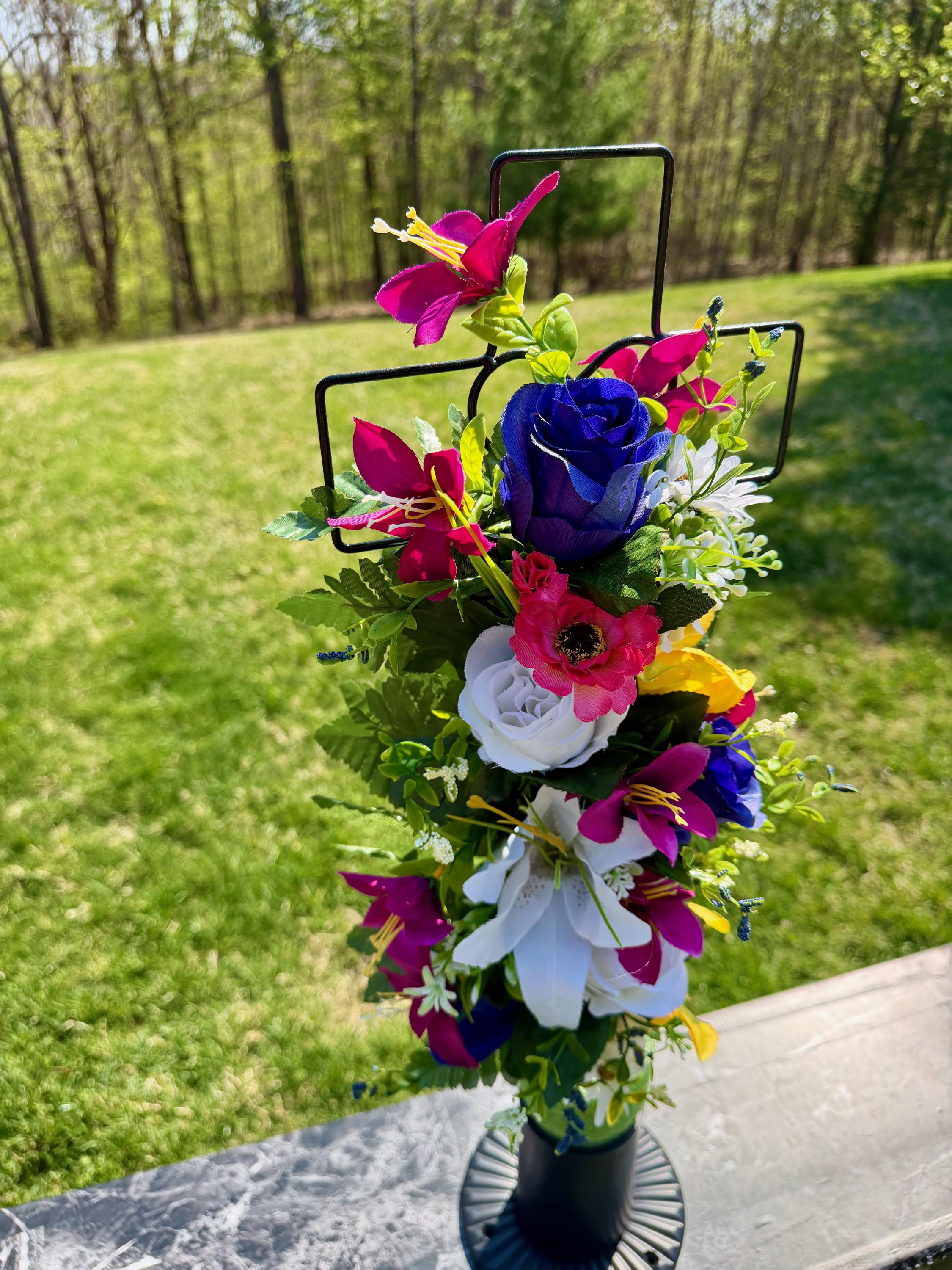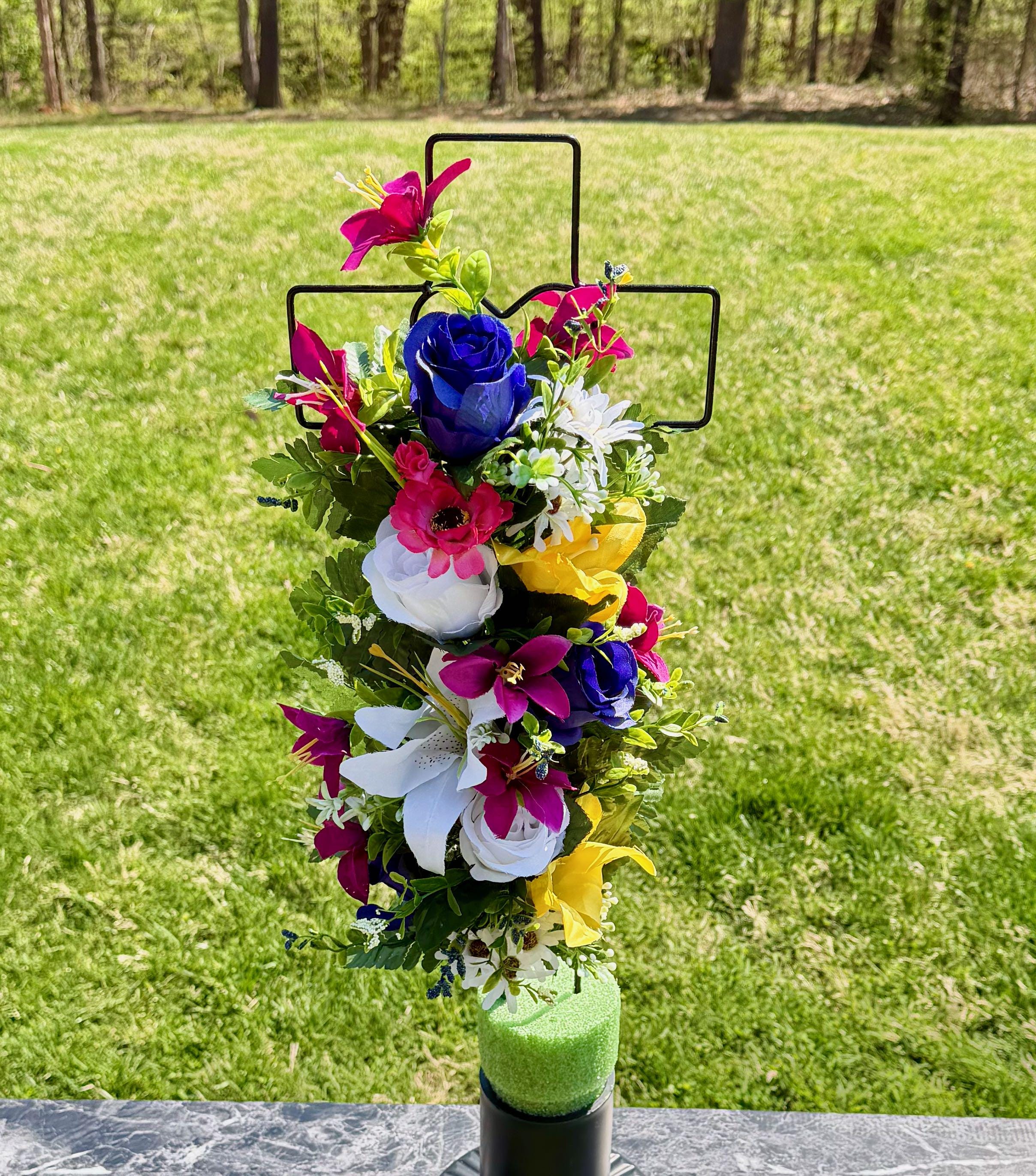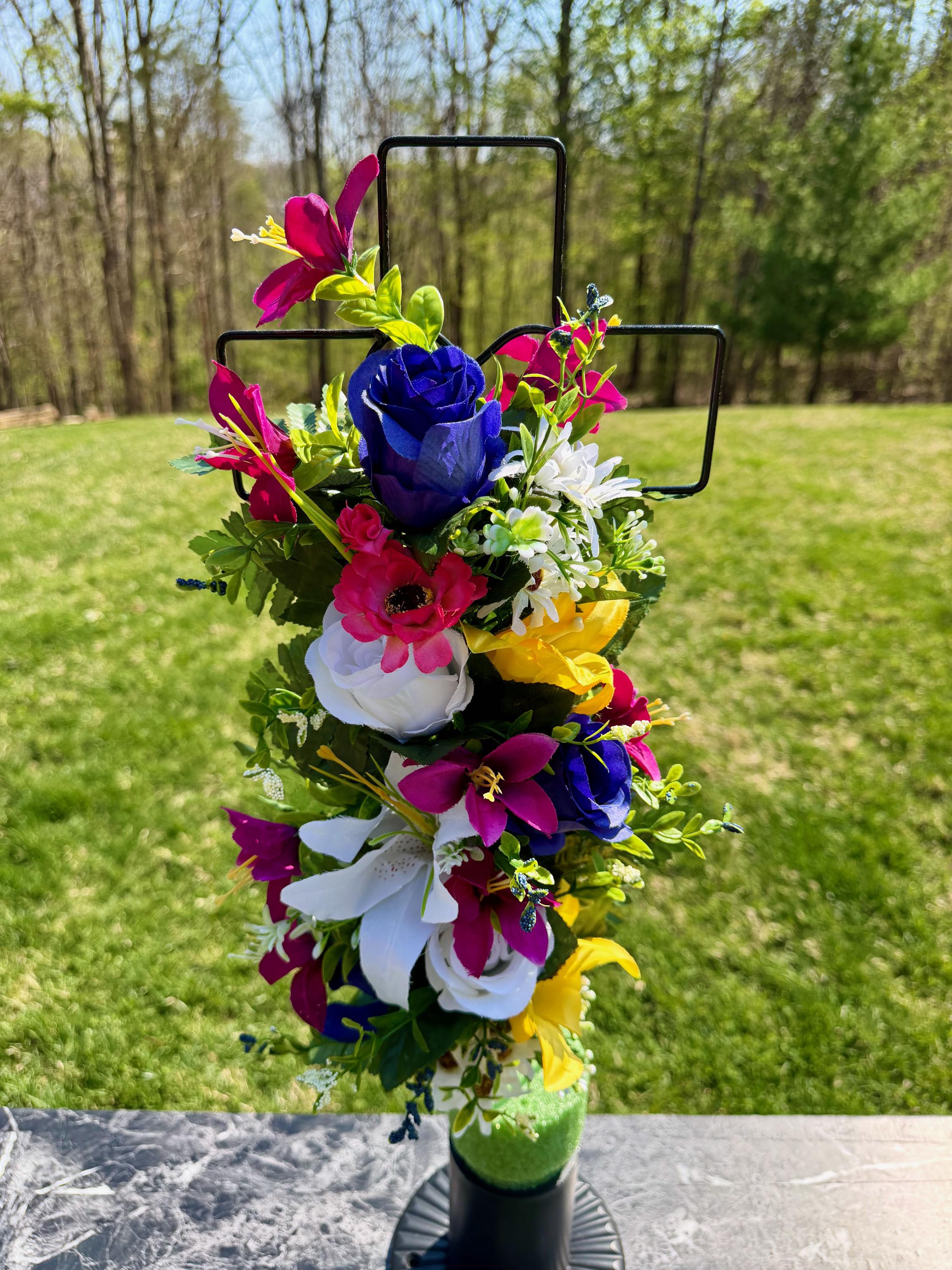 Multi-Color Silk Flower Cemetery Reusable Cross - Grave Decoration - Memorial Arrangement