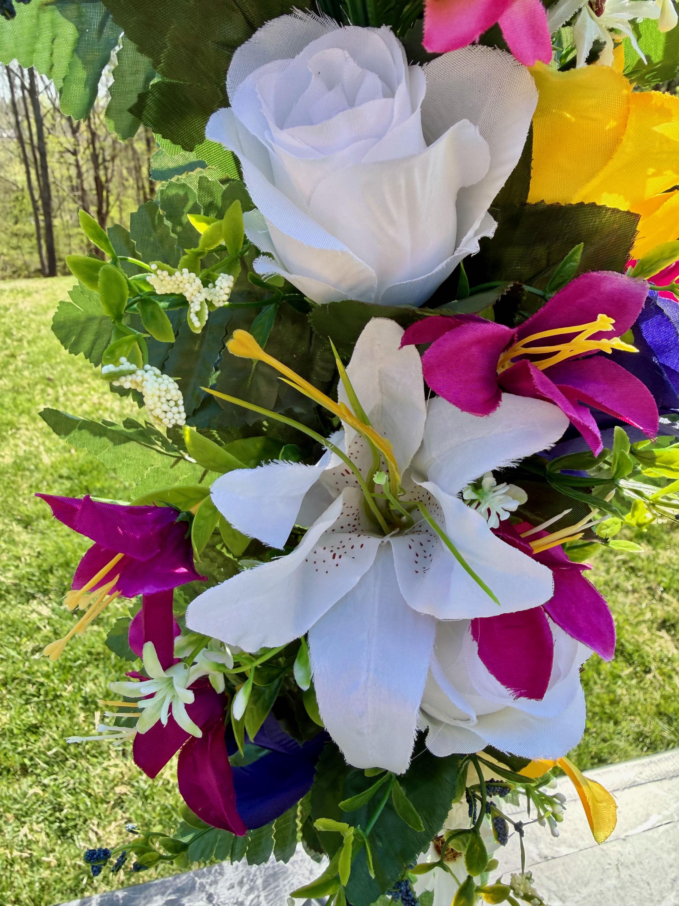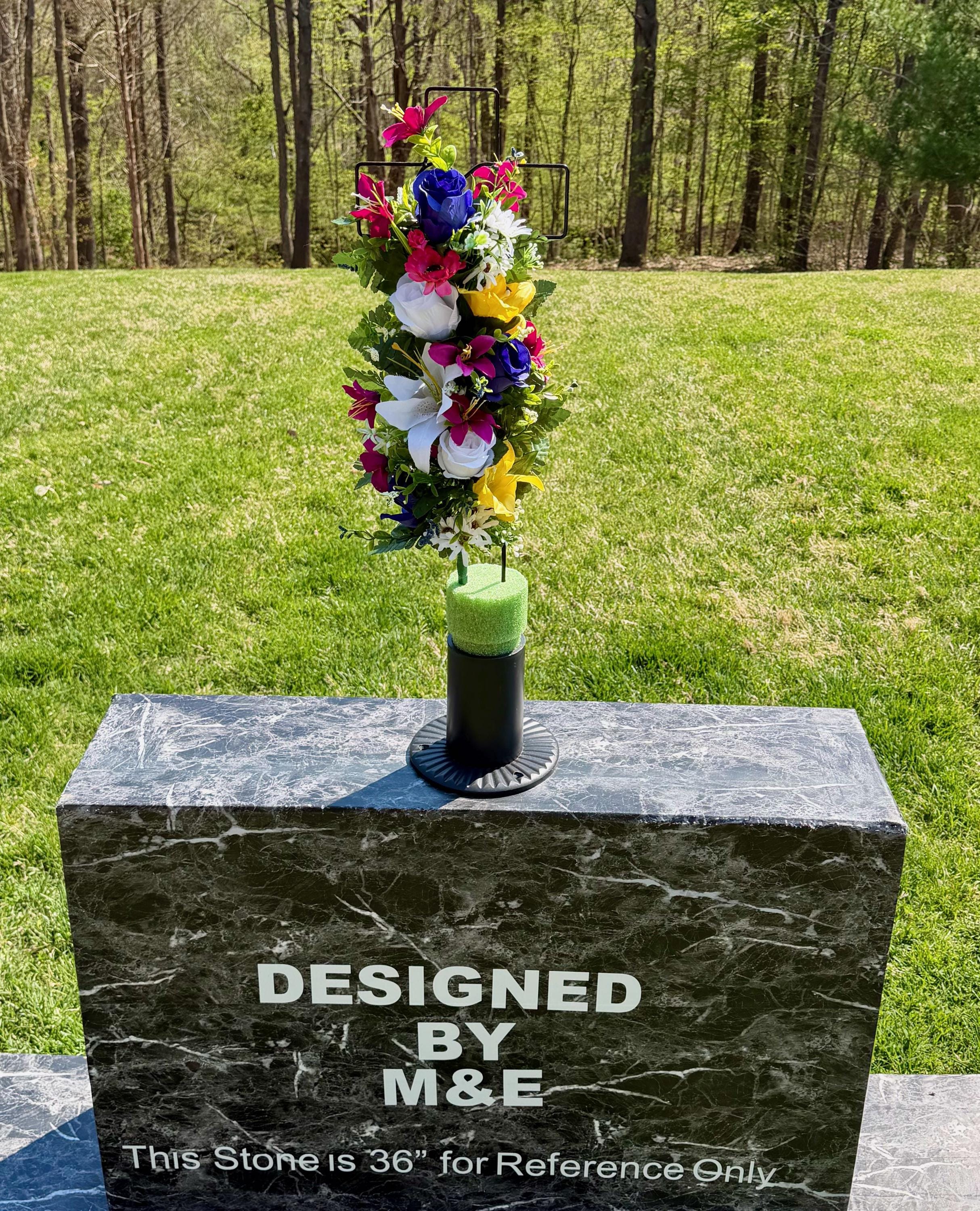 We’re a small, family-operated business consisting of myself, my husband, and my daughter. We personally manage every order and strive for excellent customer service. All our arrangements use high-quality silk flowers, though all silk blooms may fade over time. Each stem is glued into foam to withstand the elements. Designed by M&E uses only premium silks, and we put genuine care into every piece we create. Rest assured, the arrangement shown in our photos is exactly the one you’ll receive, as I design and assemble each one myself. If you’re searching for something unique or have a particular flower, color, or matching vases in mind, please contact me to discuss a custom order.