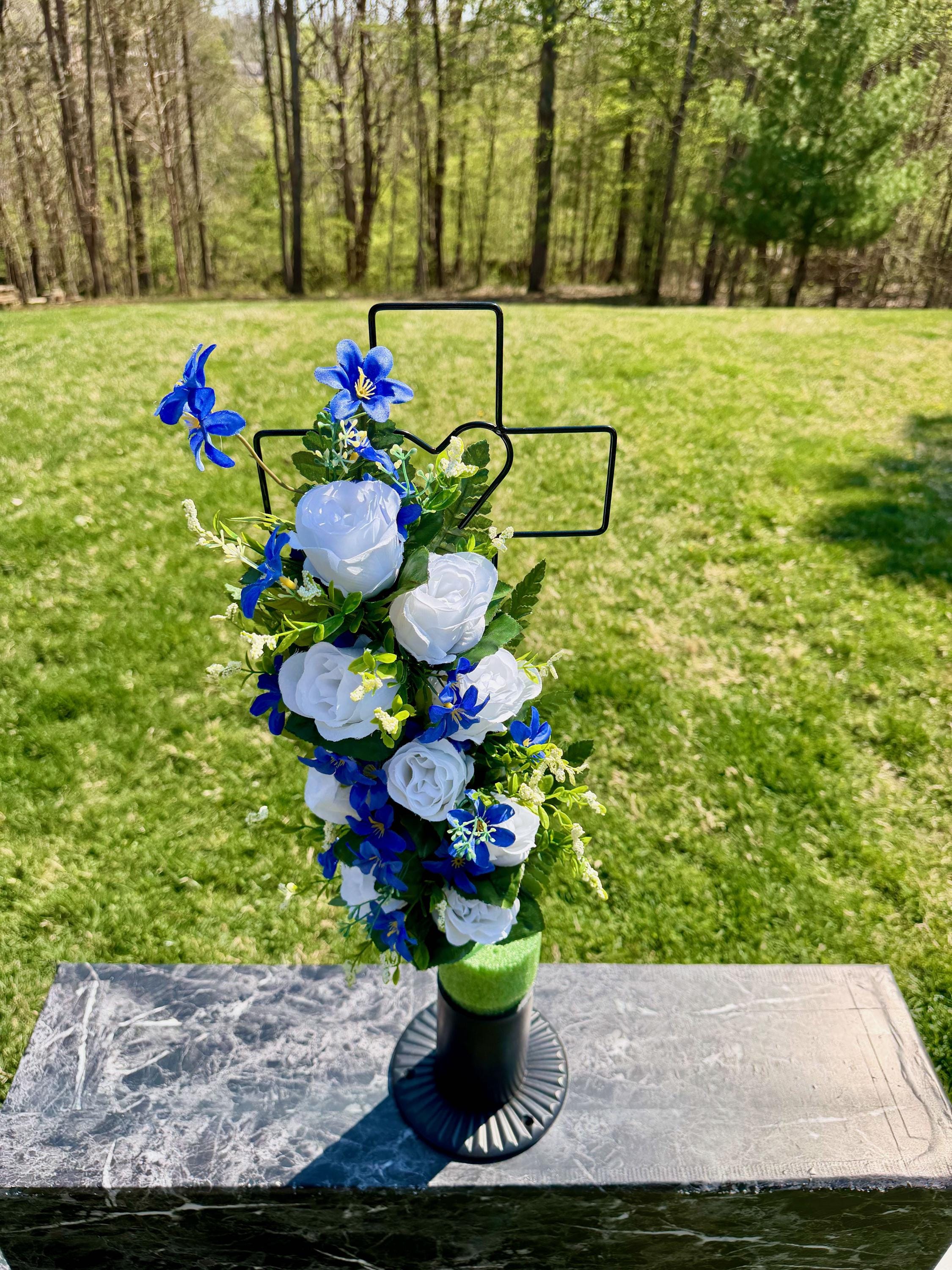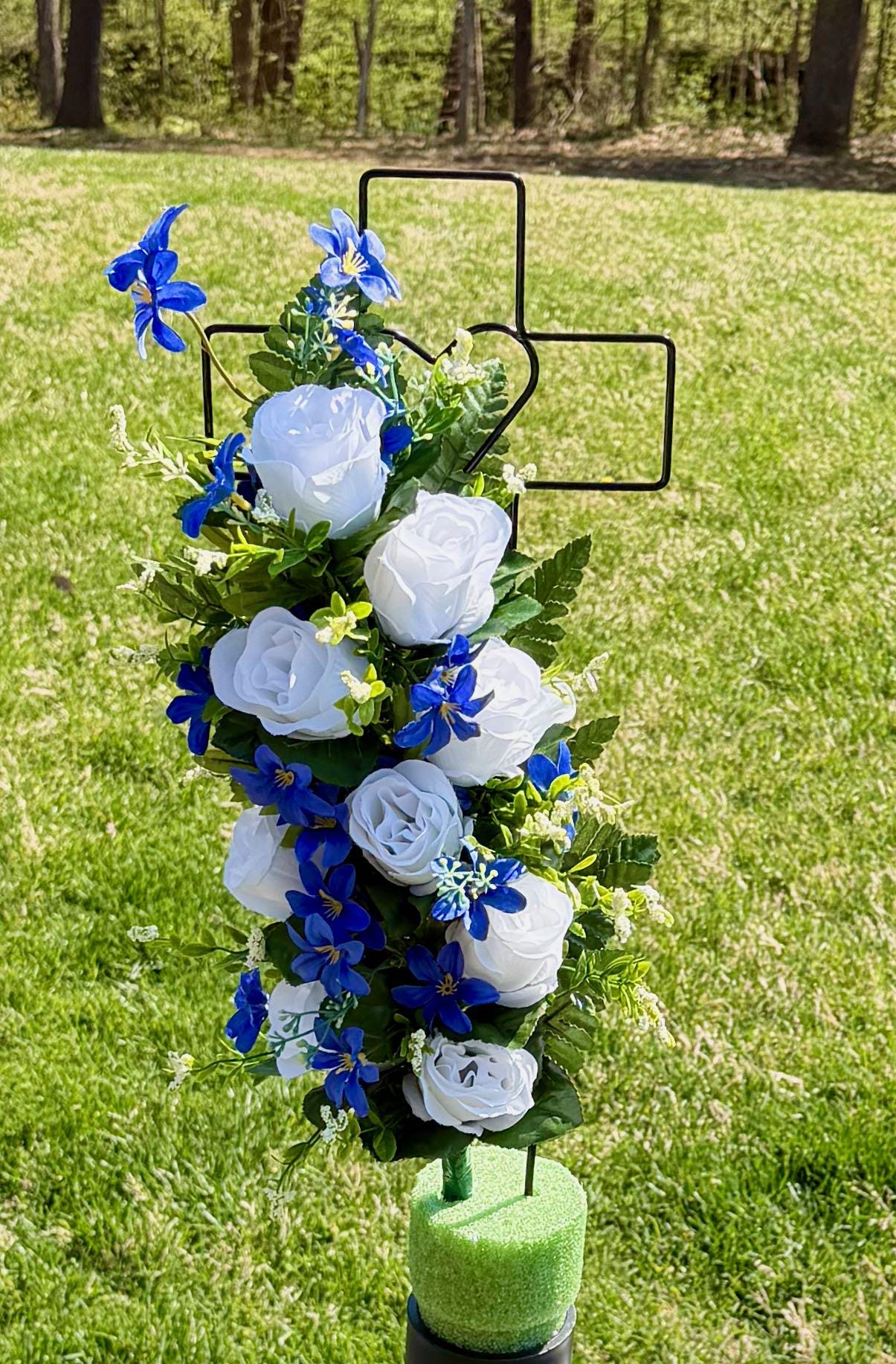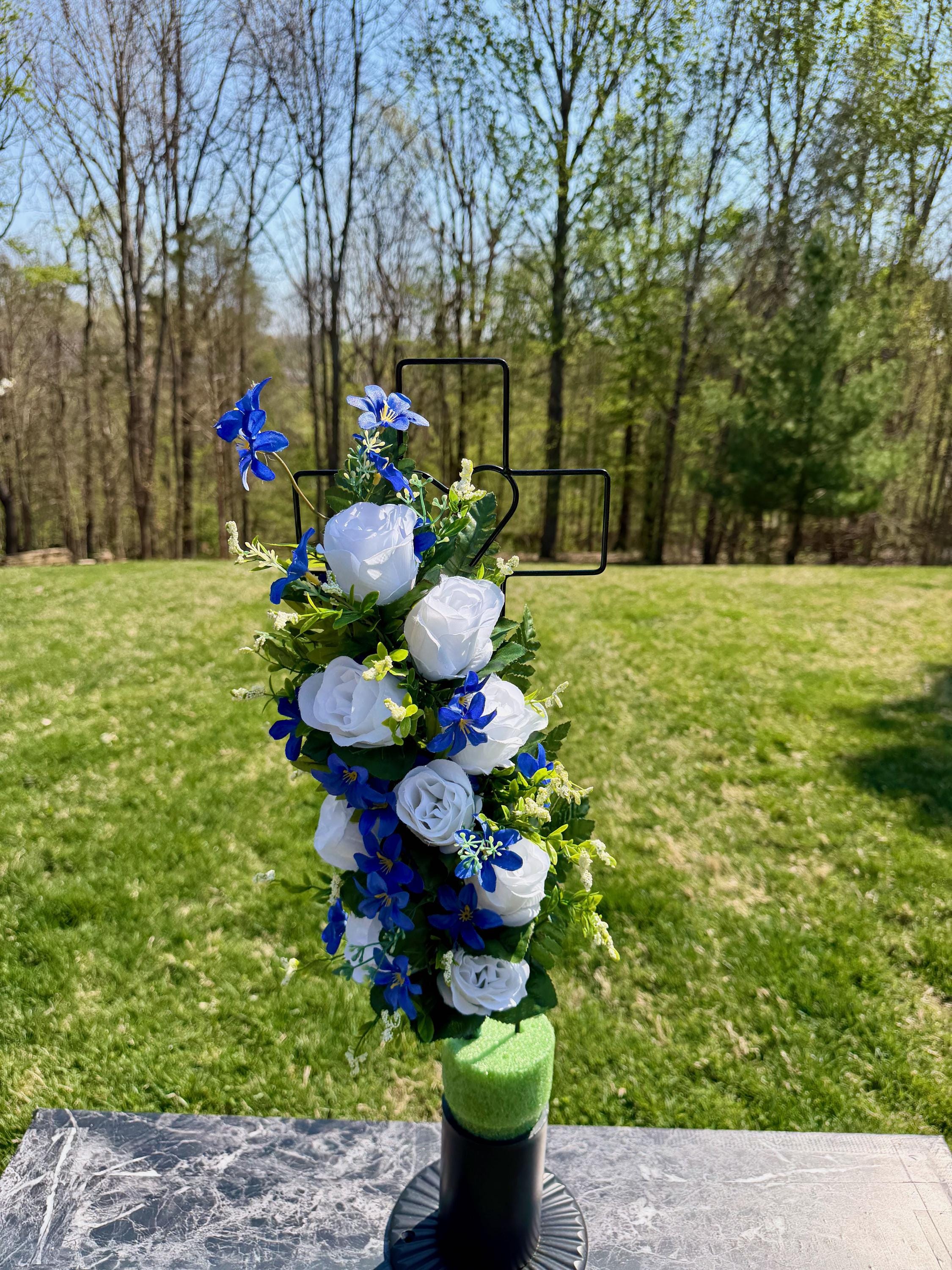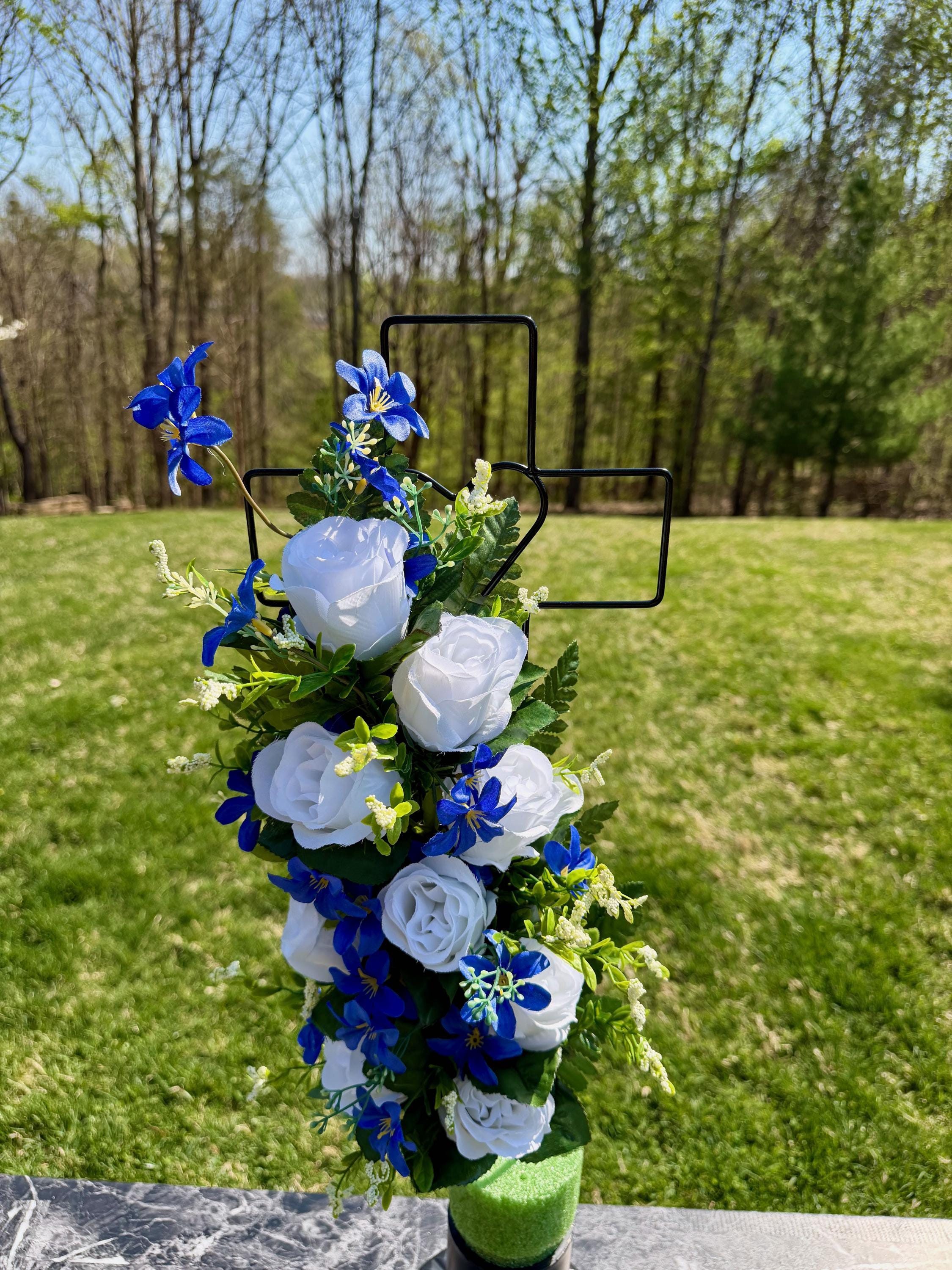 Blue and White Multi-Color Silk Flower Cemetery Reusable Cross - Grave Decoration - Memorial Arrangement