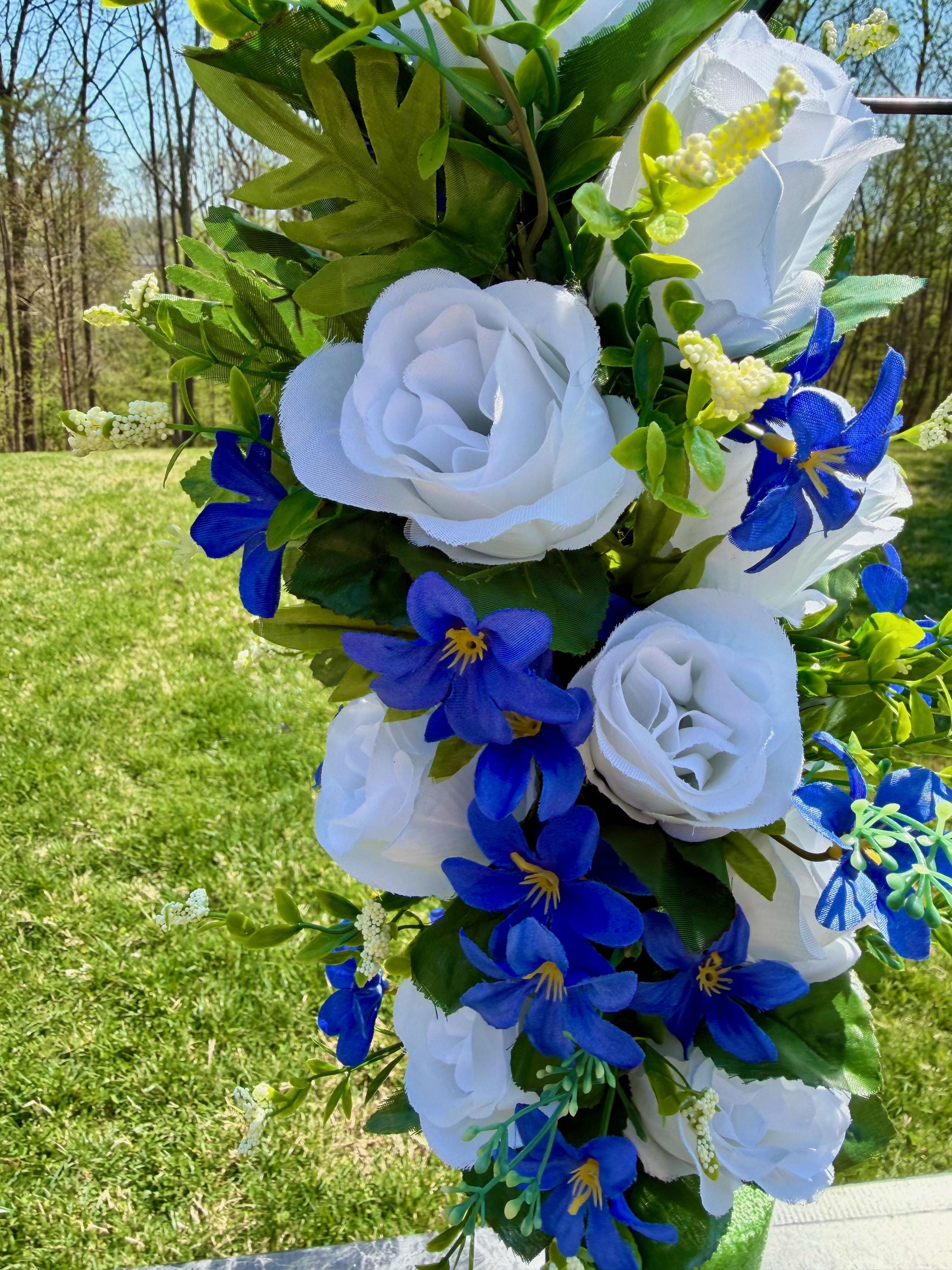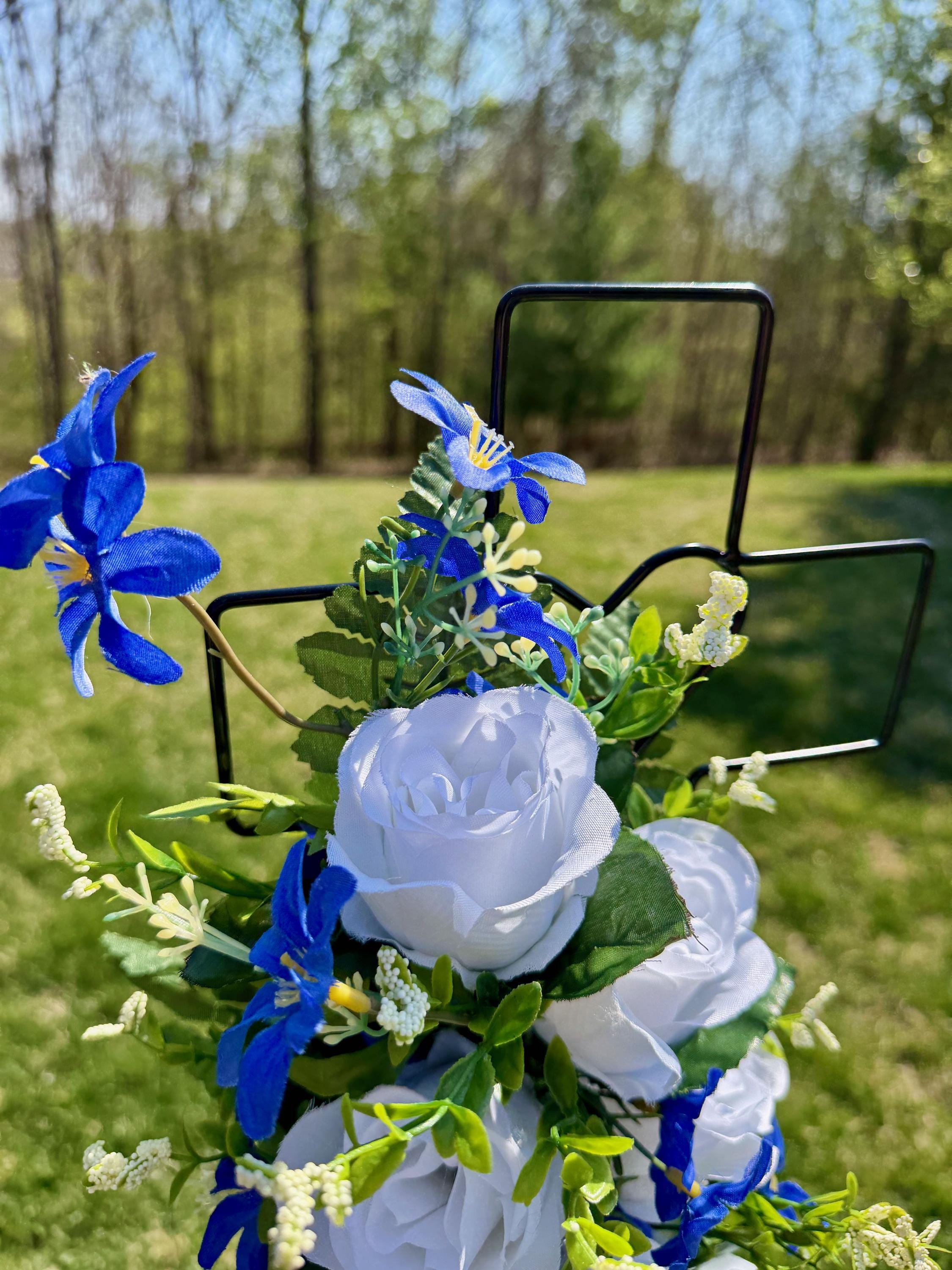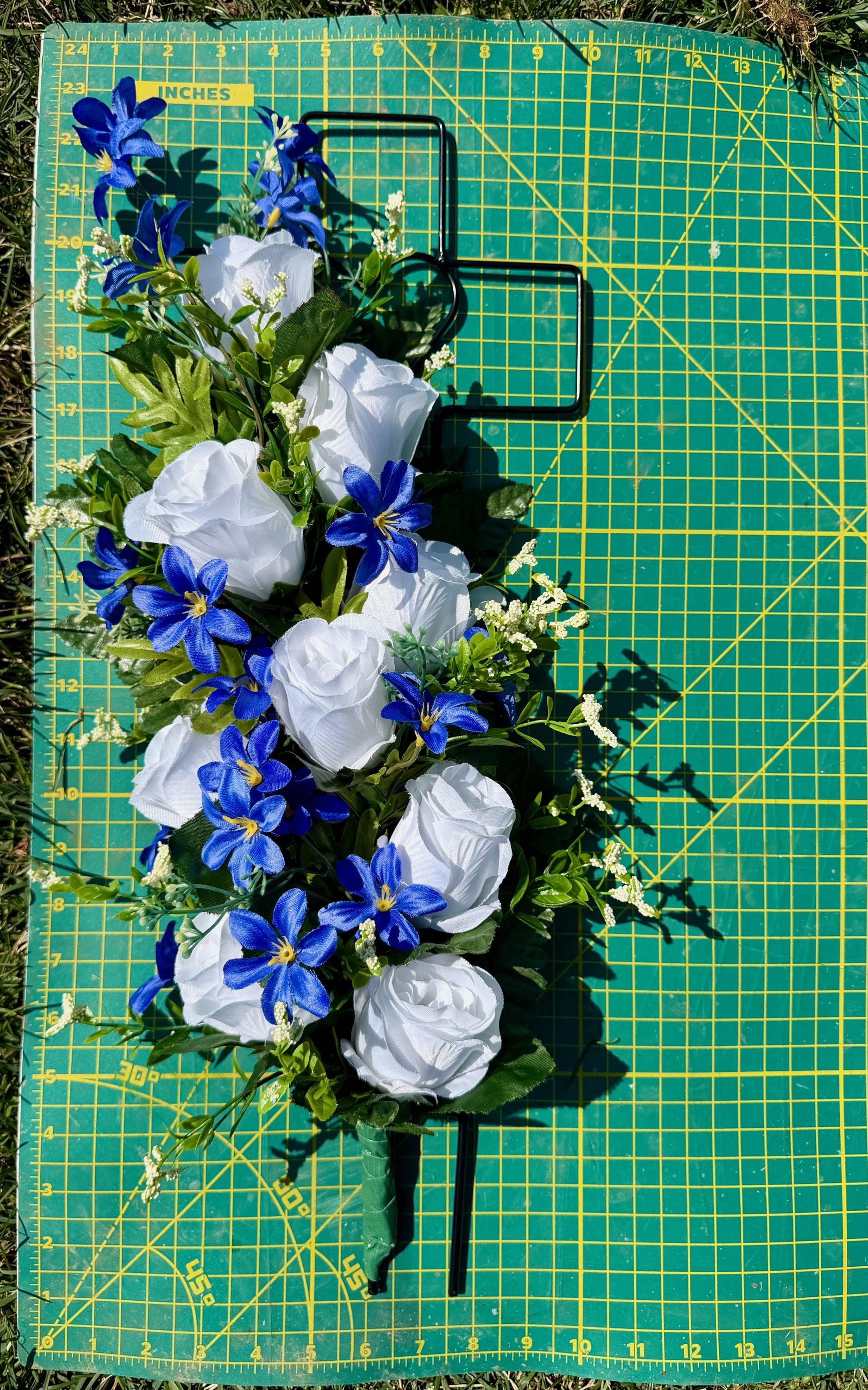 Blue and White Multi-Color Silk Flower Cemetery Reusable Cross - Grave Decoration - Memorial Arrangement