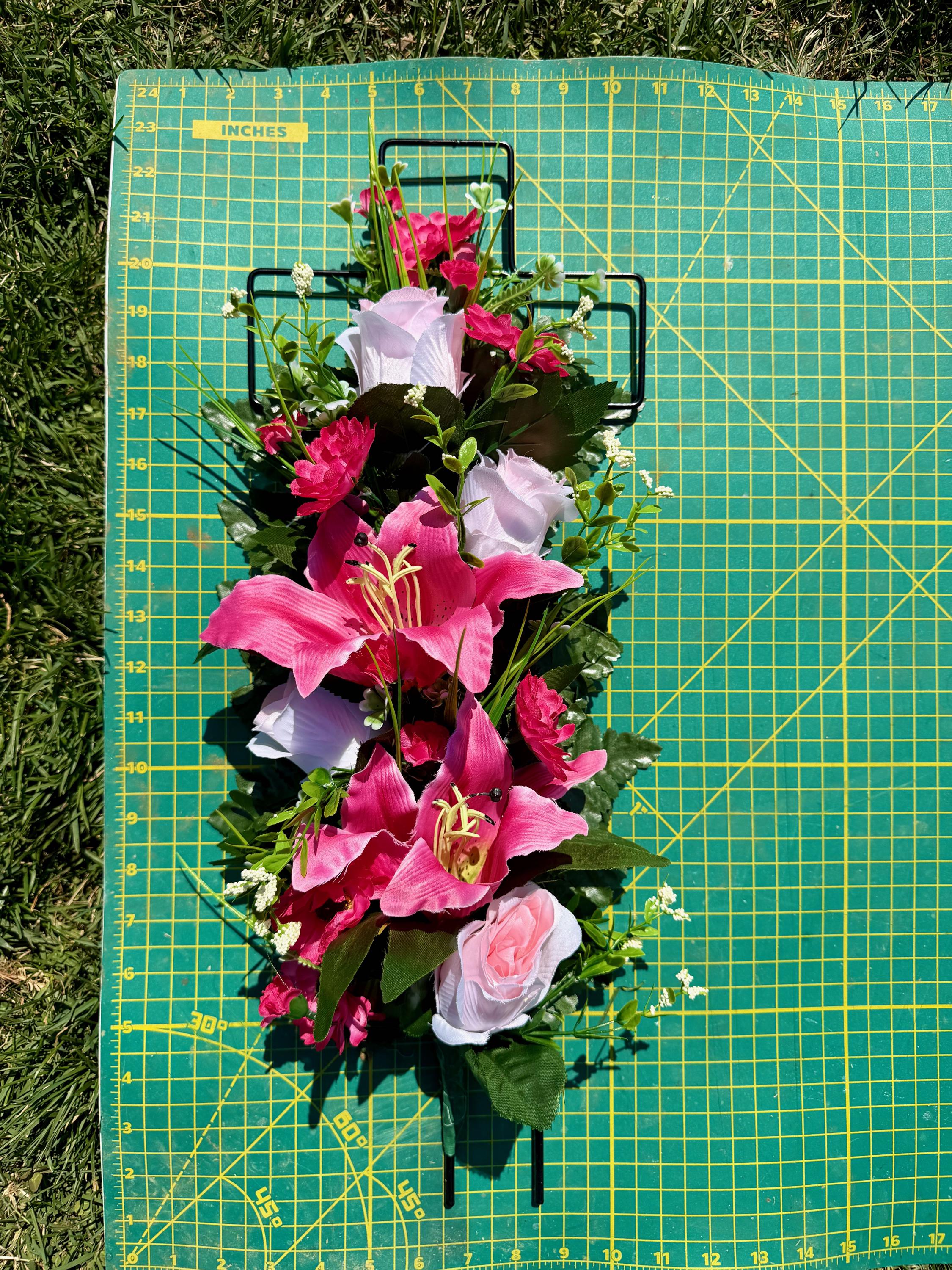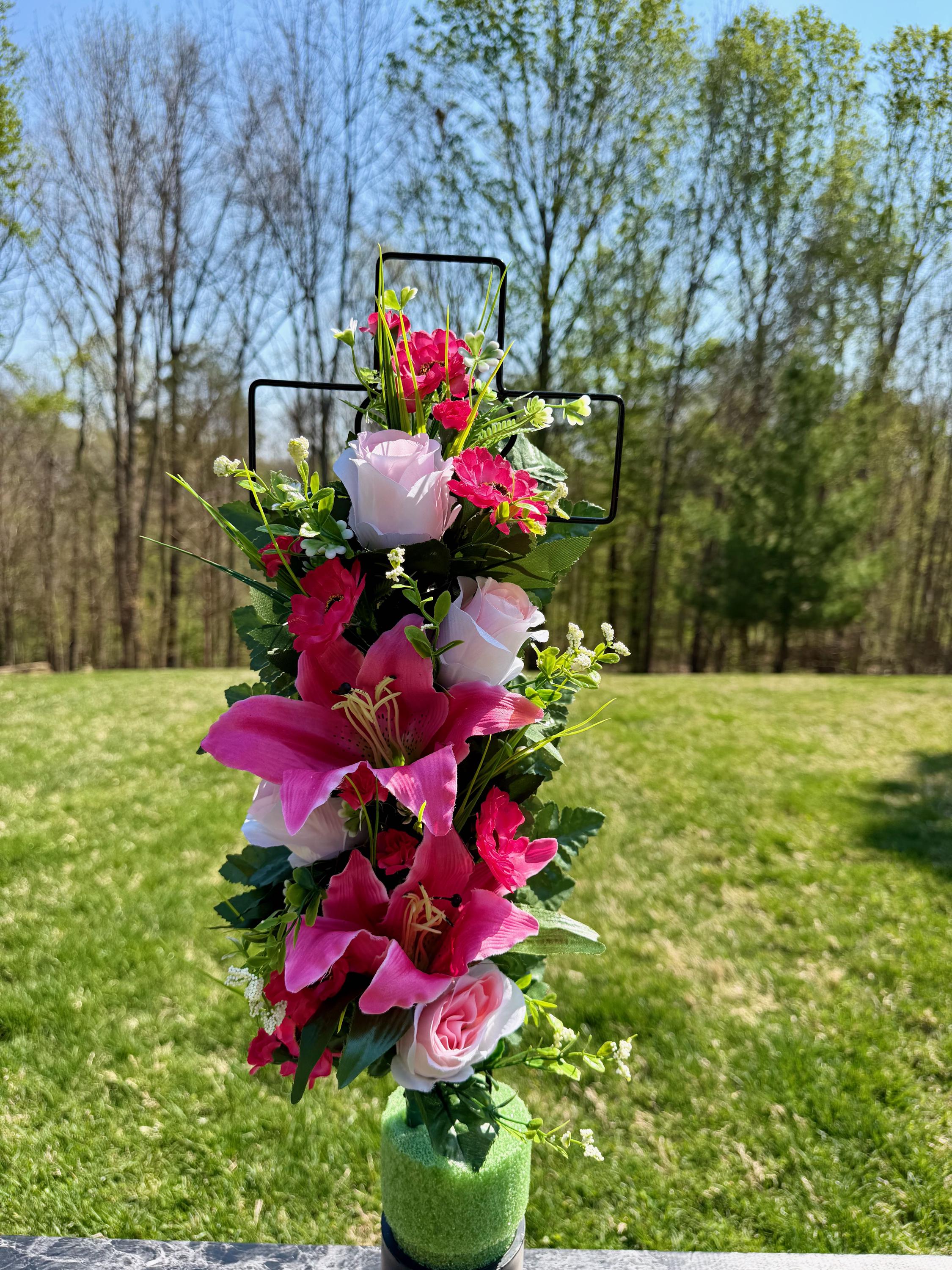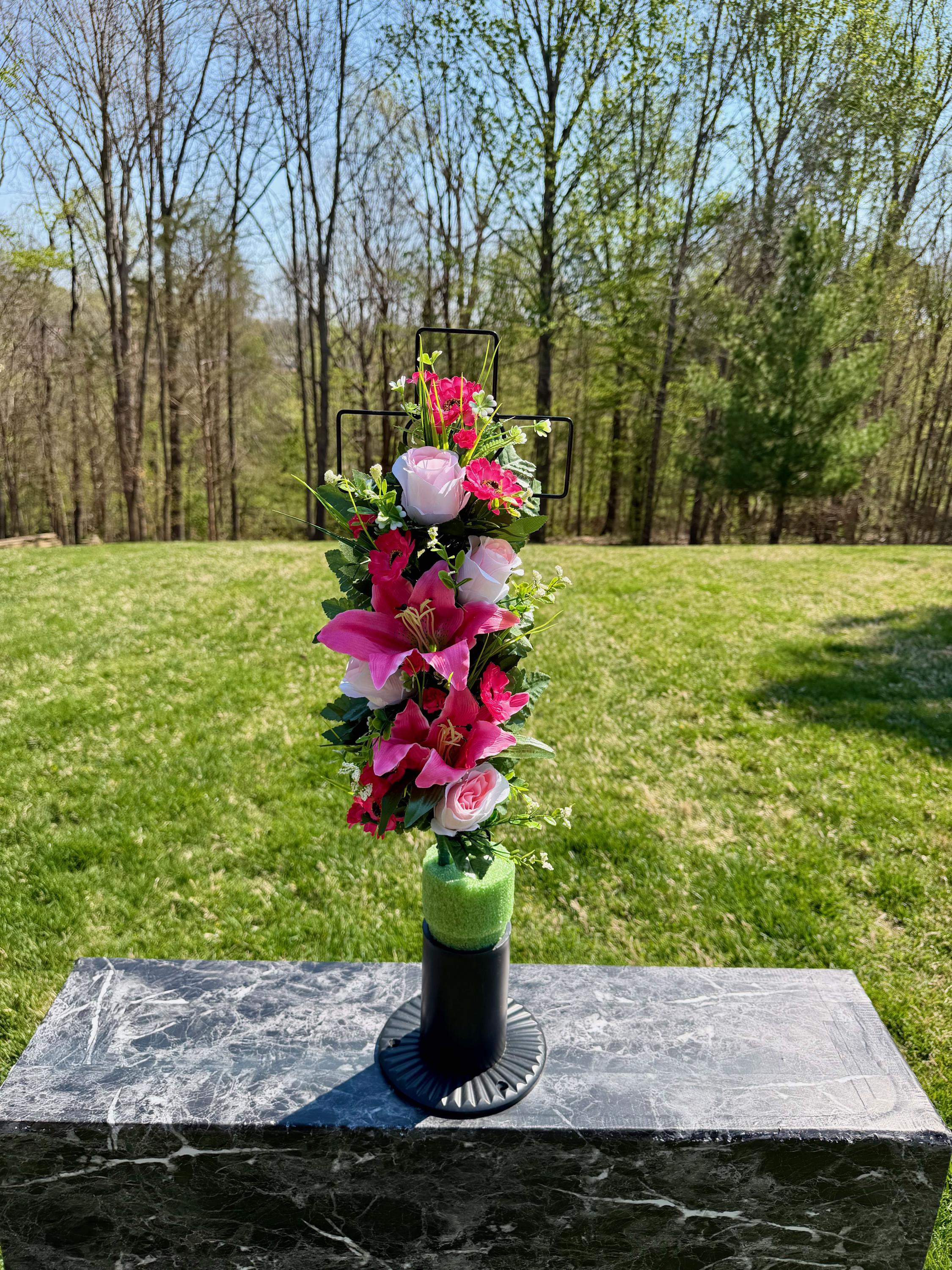 Pinks Silk Flower Cemetery Reusable Cross - Grave Decoration - Memorial Arrangement