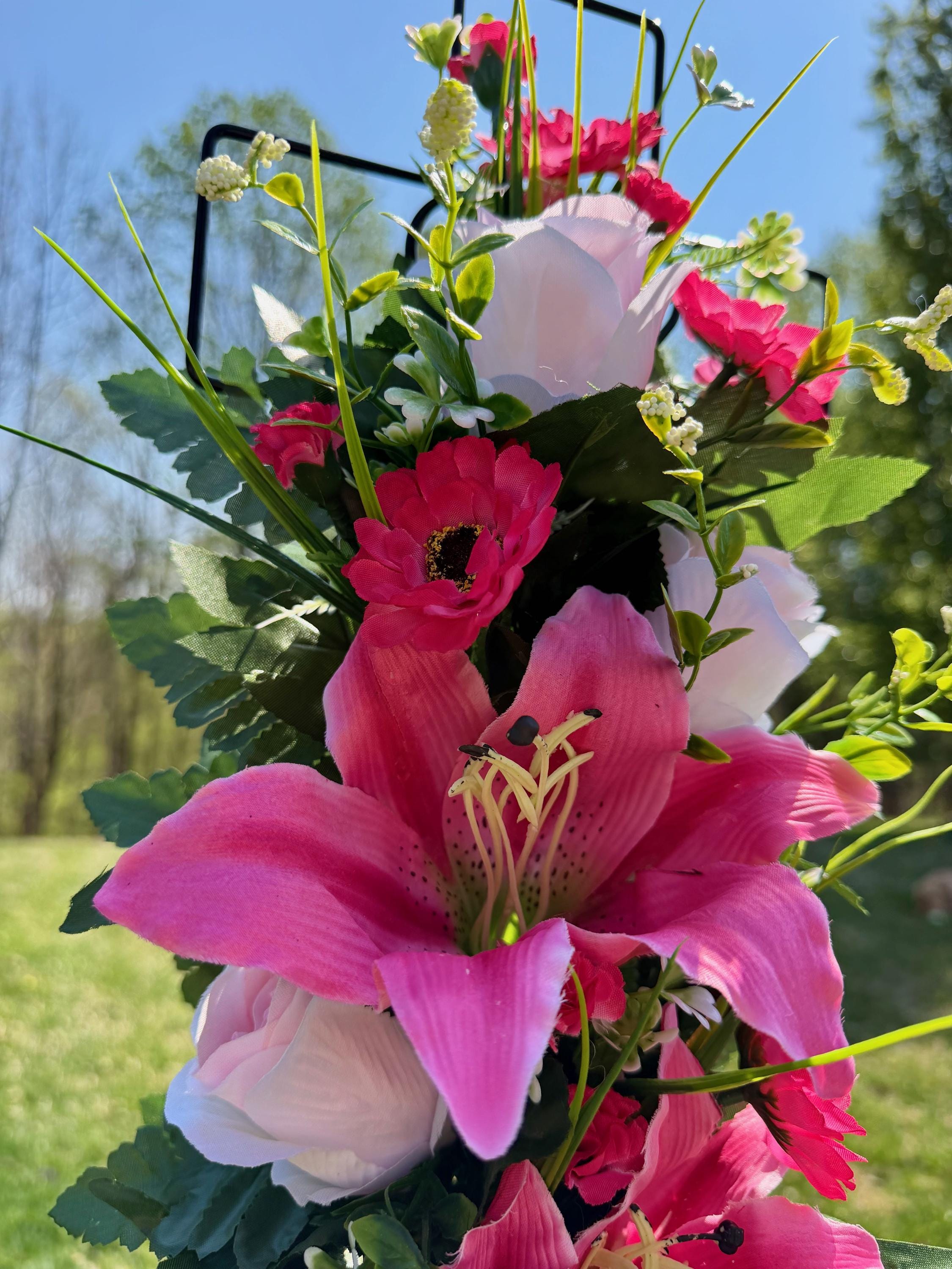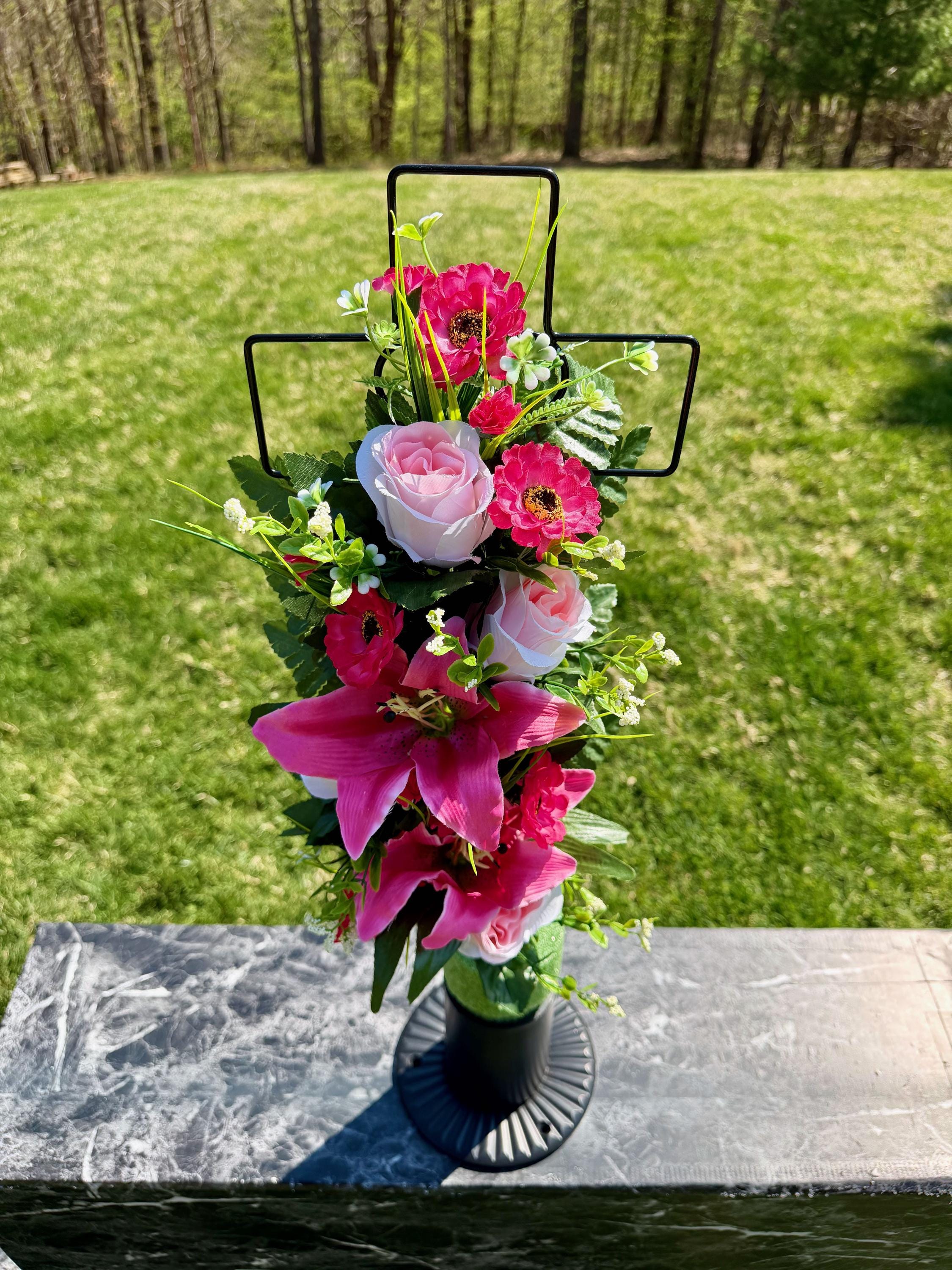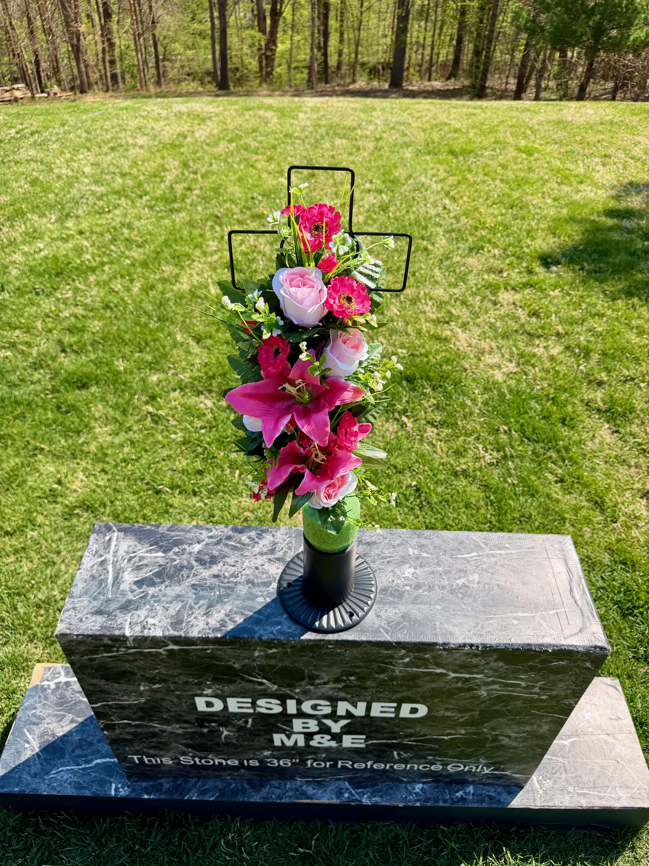 We’re a small, family-operated business consisting of myself, my husband, and my daughter. We personally manage every order and strive for excellent customer service. All our arrangements use high-quality silk flowers, though all silk blooms may fade over time. Each stem is glued into foam to withstand the elements. Designed by M&E uses only premium silks, and we put genuine care into every piece we create. Rest assured, the arrangement shown in our photos is exactly the one you’ll receive, as I design and assemble each one myself. If you’re searching for something unique or have a particular flower, color, or matching vases in mind, please contact me to discuss a custom order.