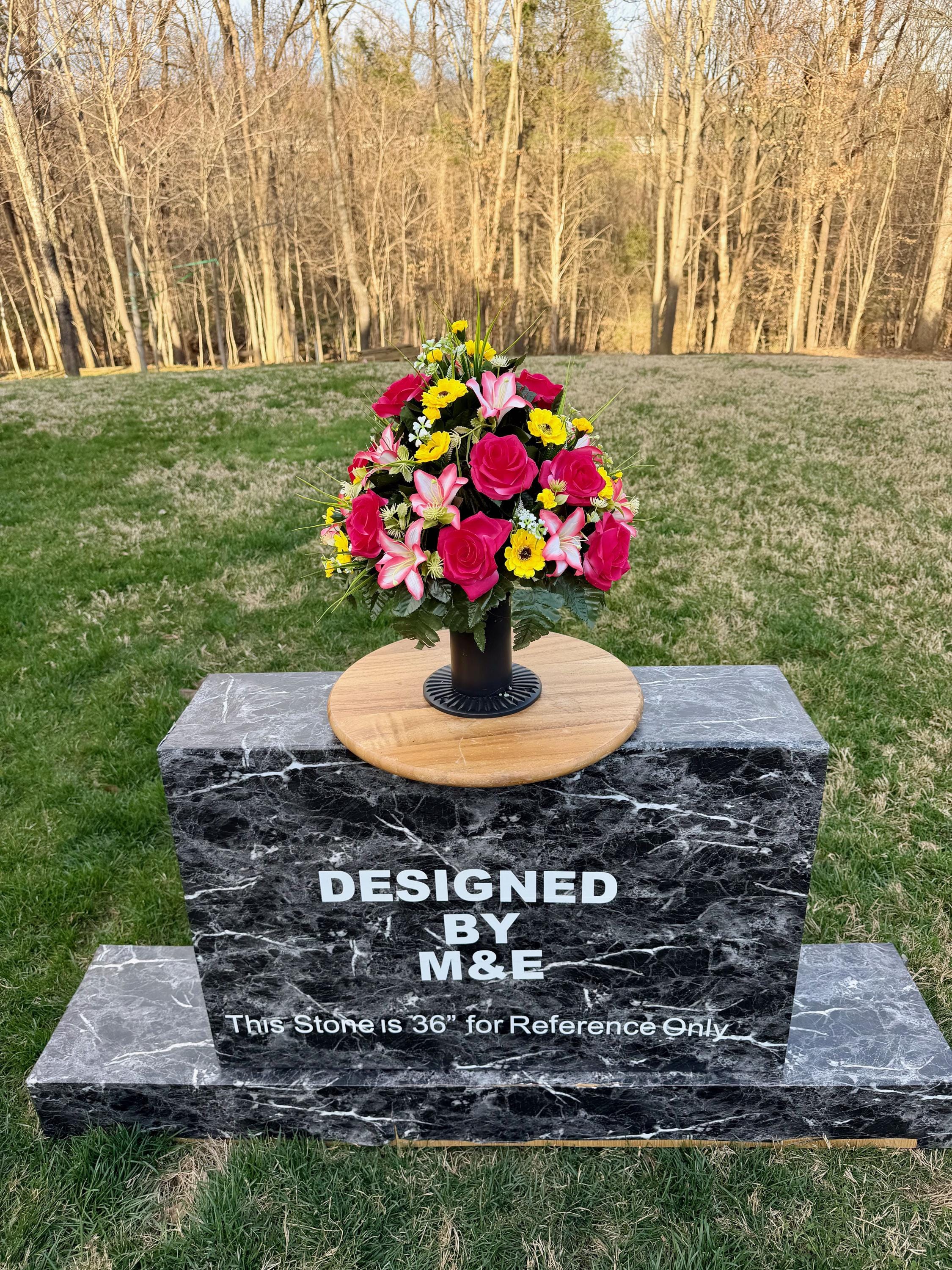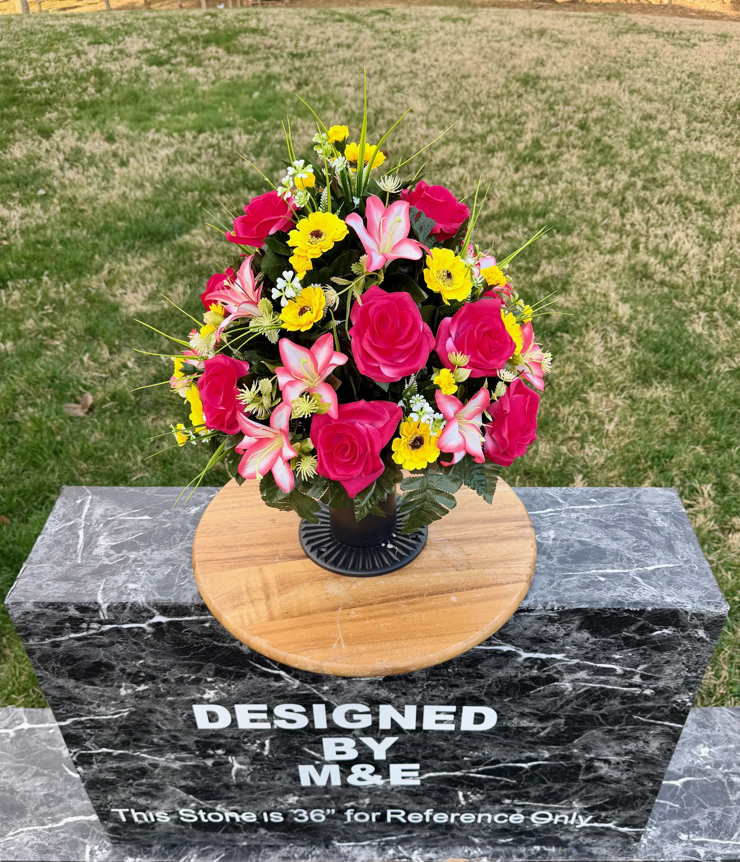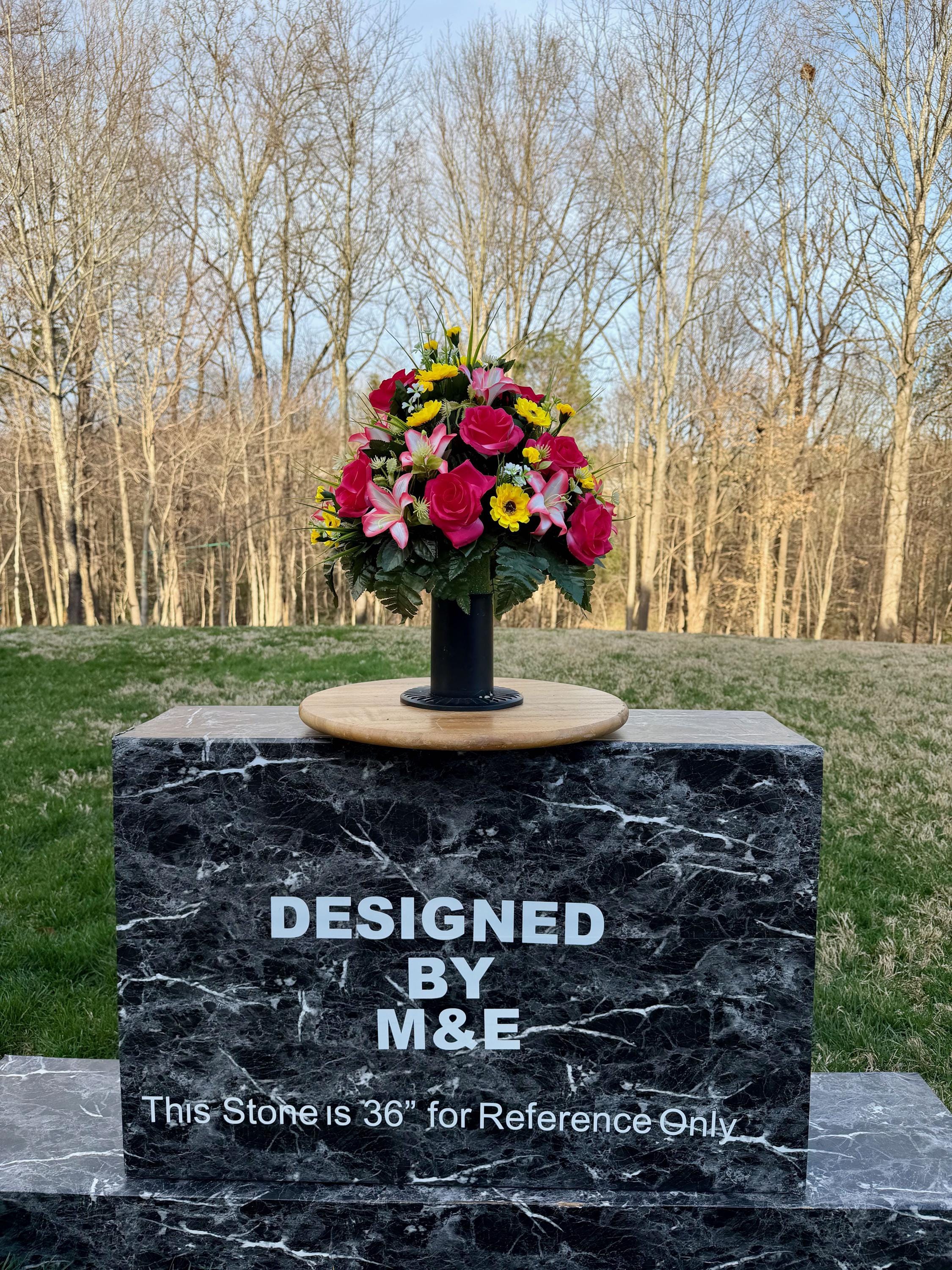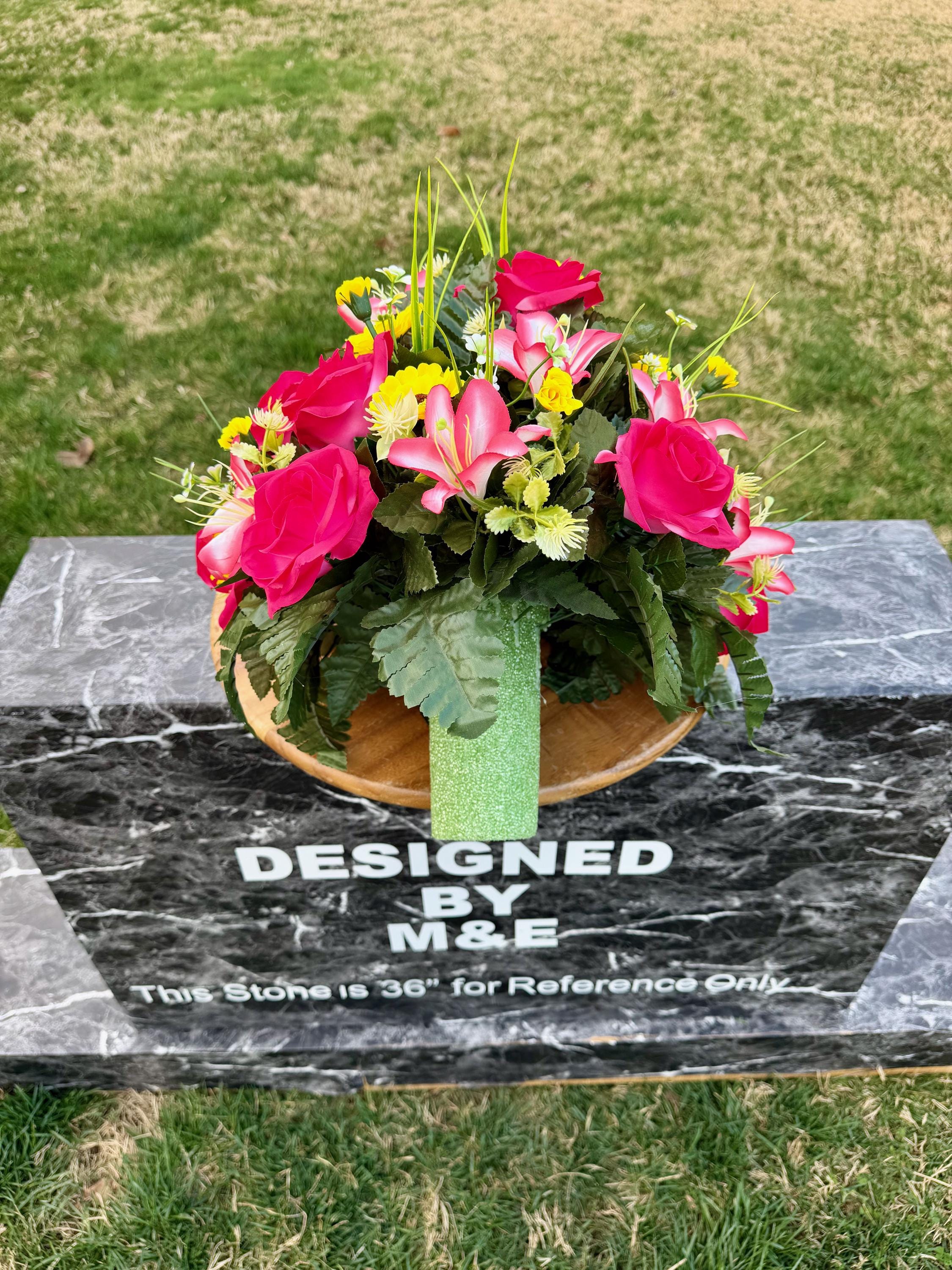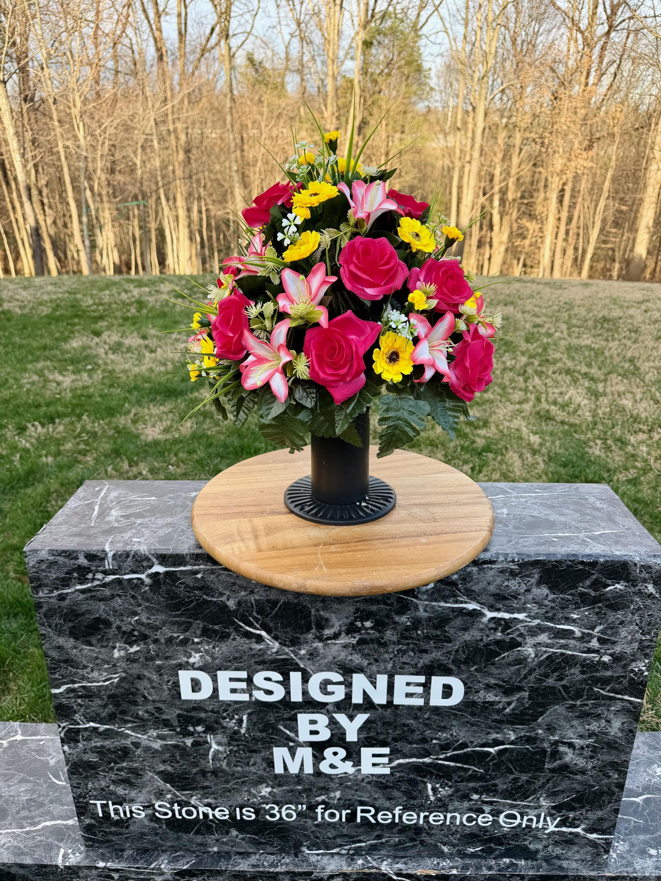 We’re a small, family-operated business consisting of myself, my husband, and my daughter. We personally manage every order and strive for excellent customer service. All our arrangements use high-quality silk flowers, though all silk blooms may fade over time. Each stem is glued into foam to withstand the elements. Designed by M&E uses only premium silks, and we put genuine care into every piece we create. Rest assured, the arrangement shown in our photos is exactly the one you’ll receive, as I design and assemble each one myself. If you’re searching for something unique or have a particular flower, color, or matching vases in mind, please contact me to discuss a custom order.