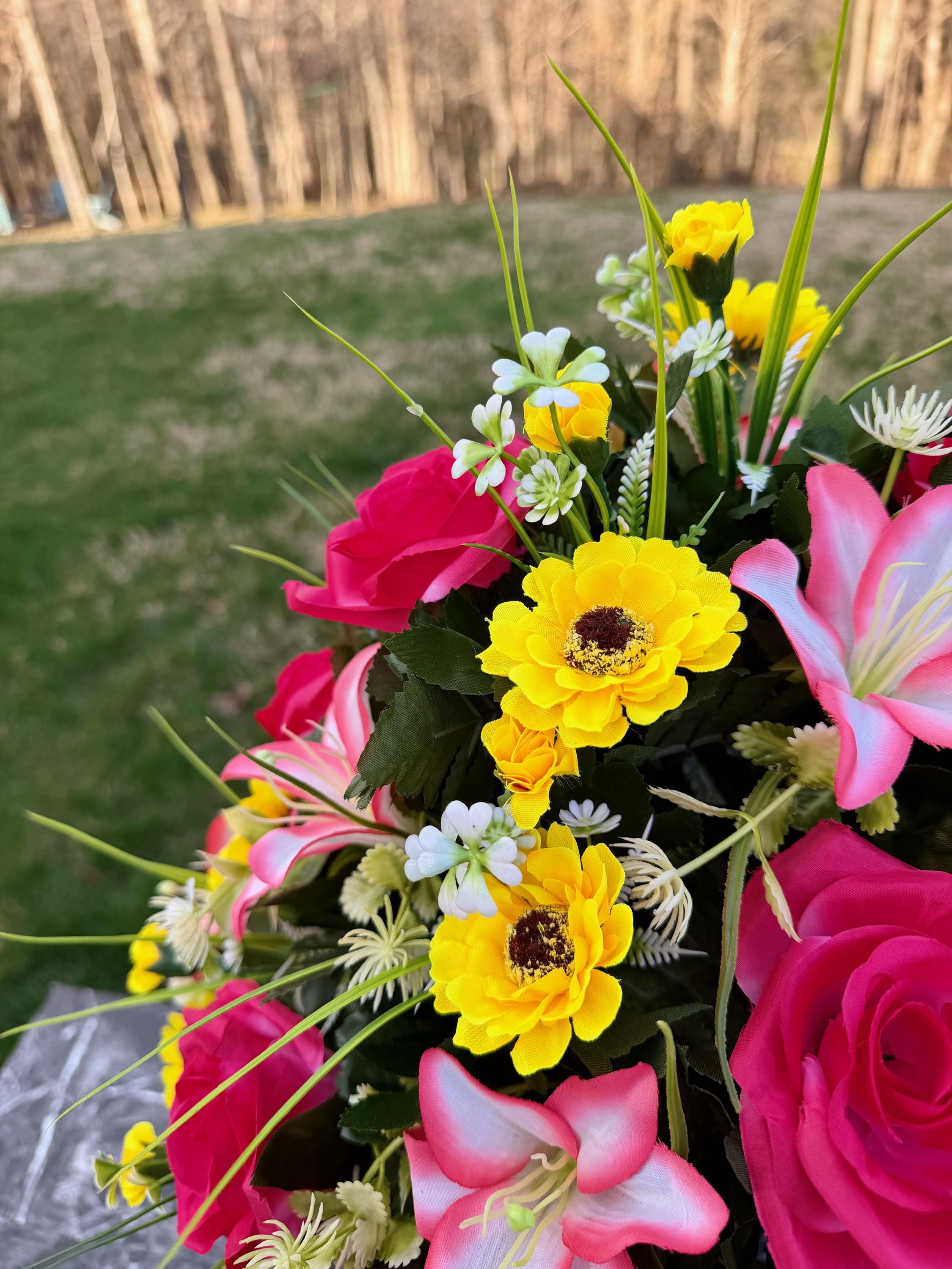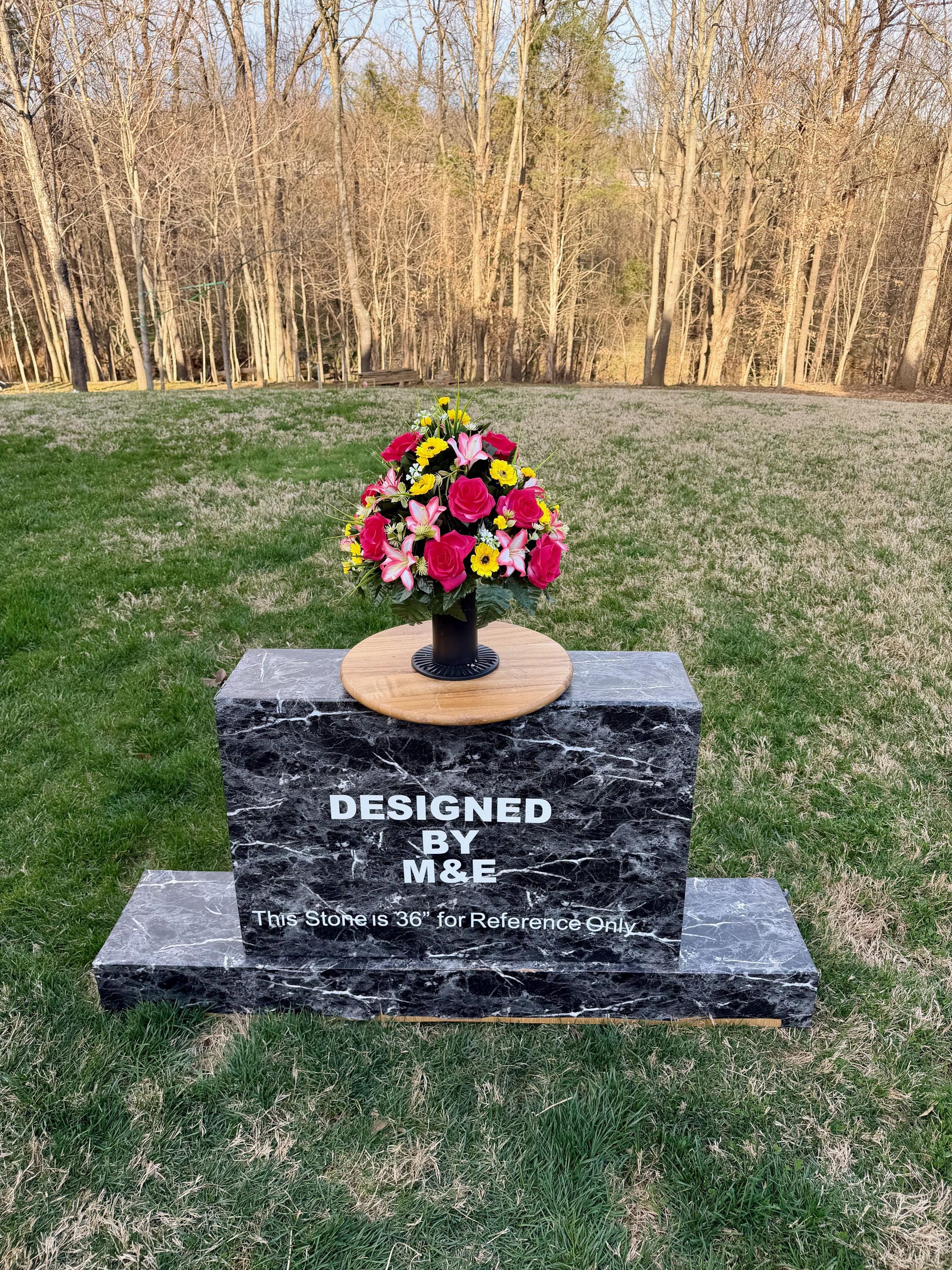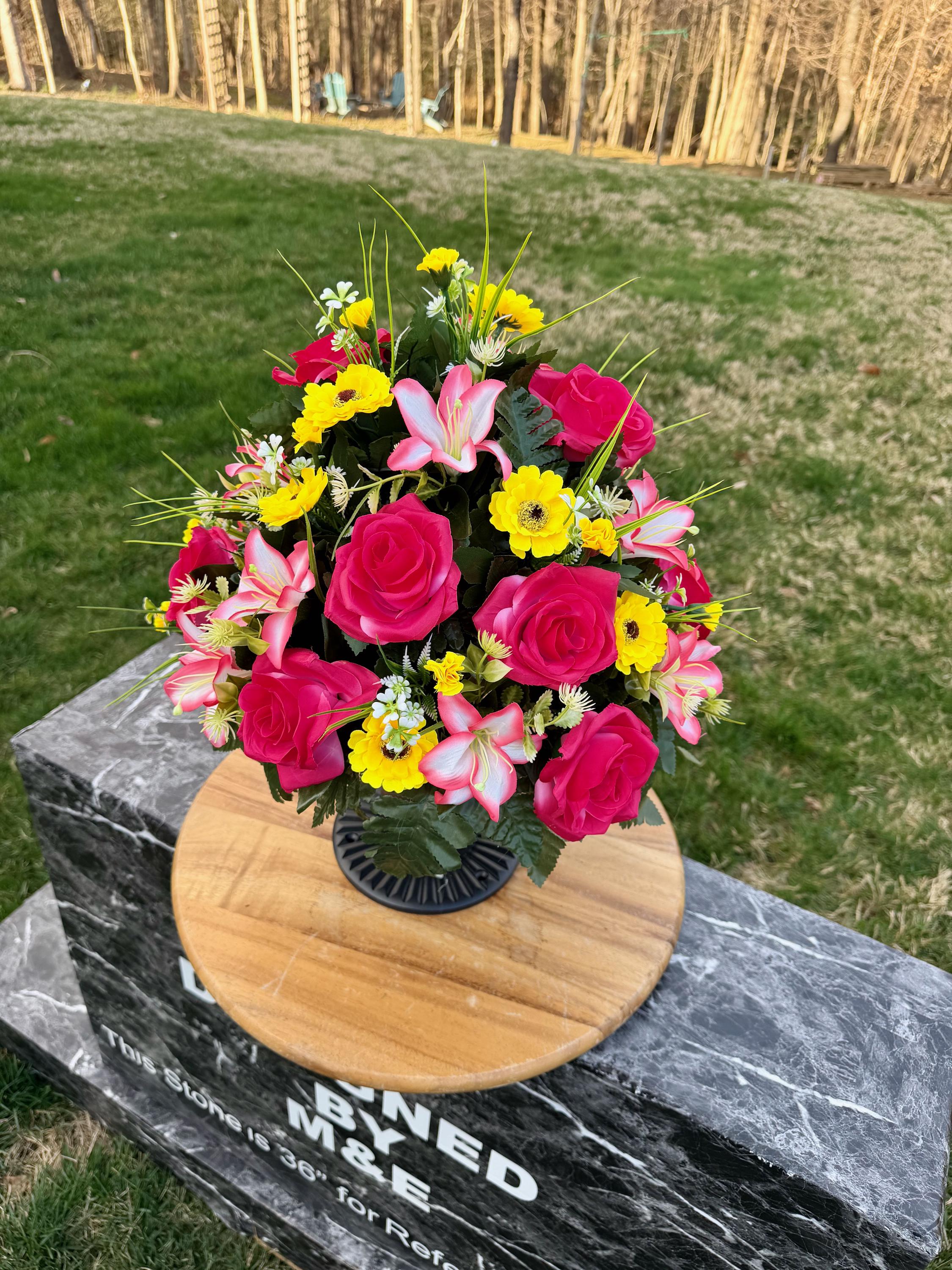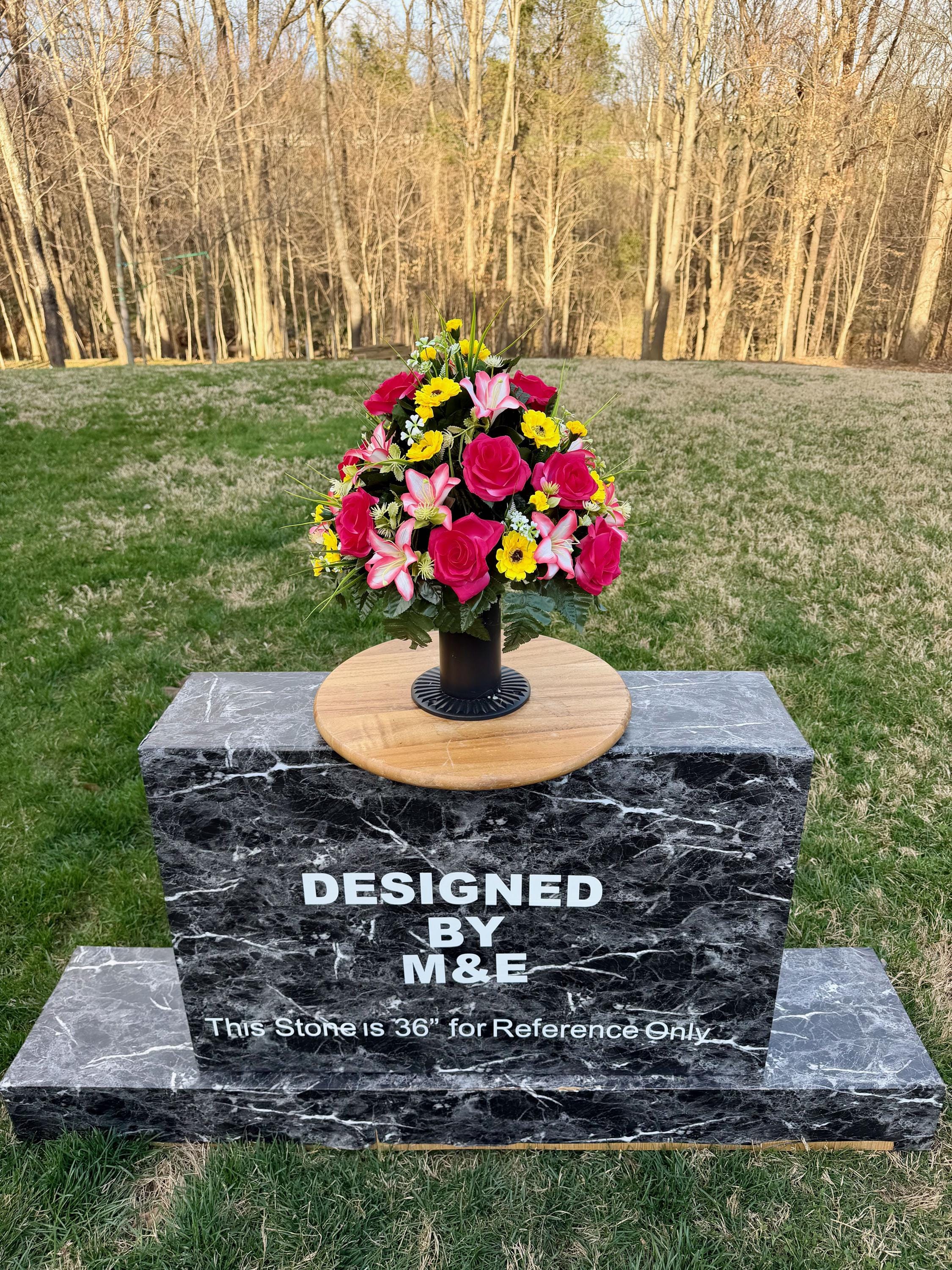 We’re a small, family-operated business consisting of myself, my husband, and my daughter. We personally manage every order and strive for excellent customer service. All our arrangements use high-quality silk flowers, though all silk blooms may fade over time. Each stem is glued into foam to withstand the elements. Designed by M&E uses only premium silks, and we put genuine care into every piece we create. Rest assured, the arrangement shown in our photos is exactly the one you’ll receive, as I design and assemble each one myself. If you’re searching for something unique or have a particular flower, color, or matching vases in mind, please contact me to discuss a custom order.