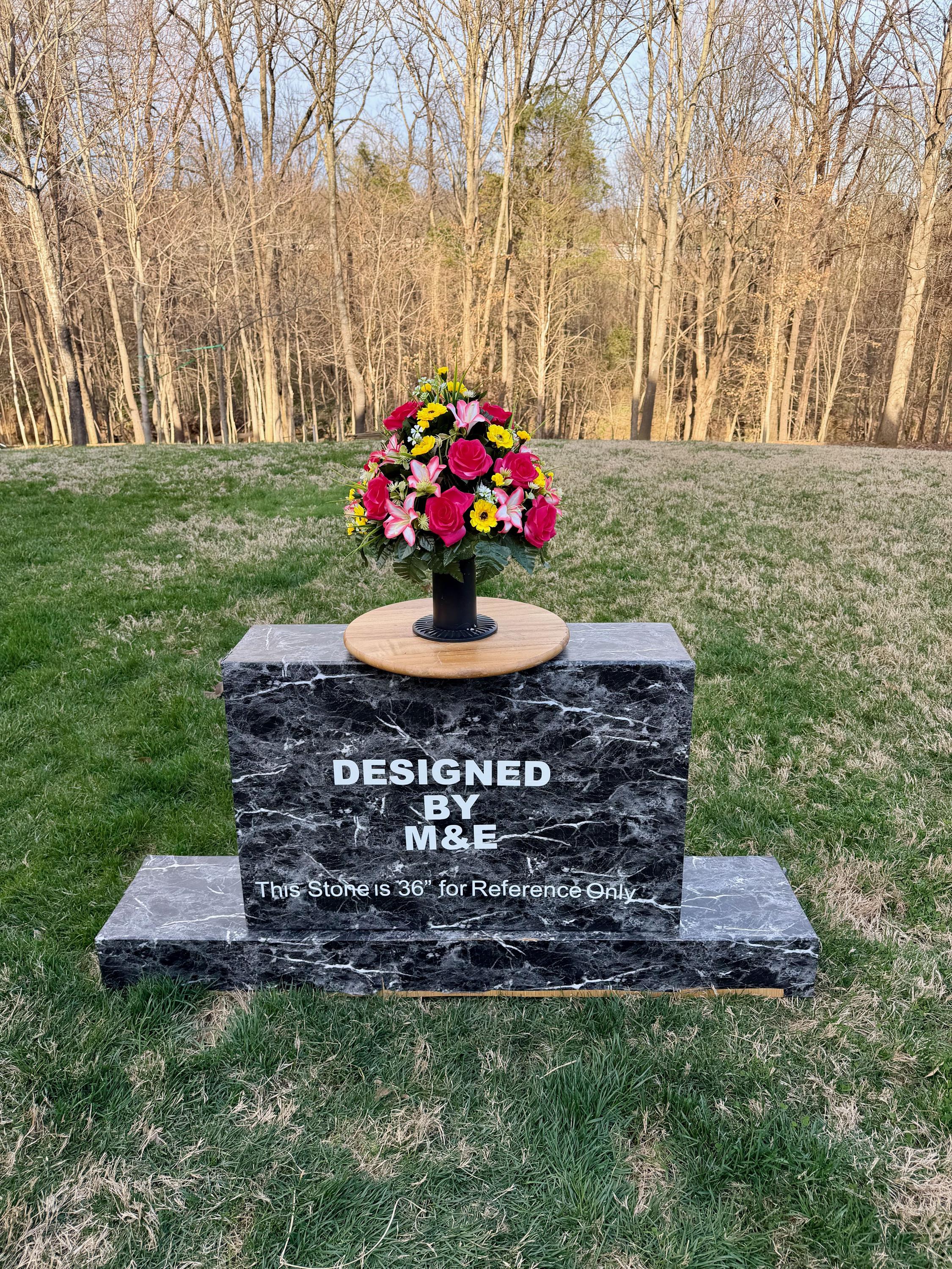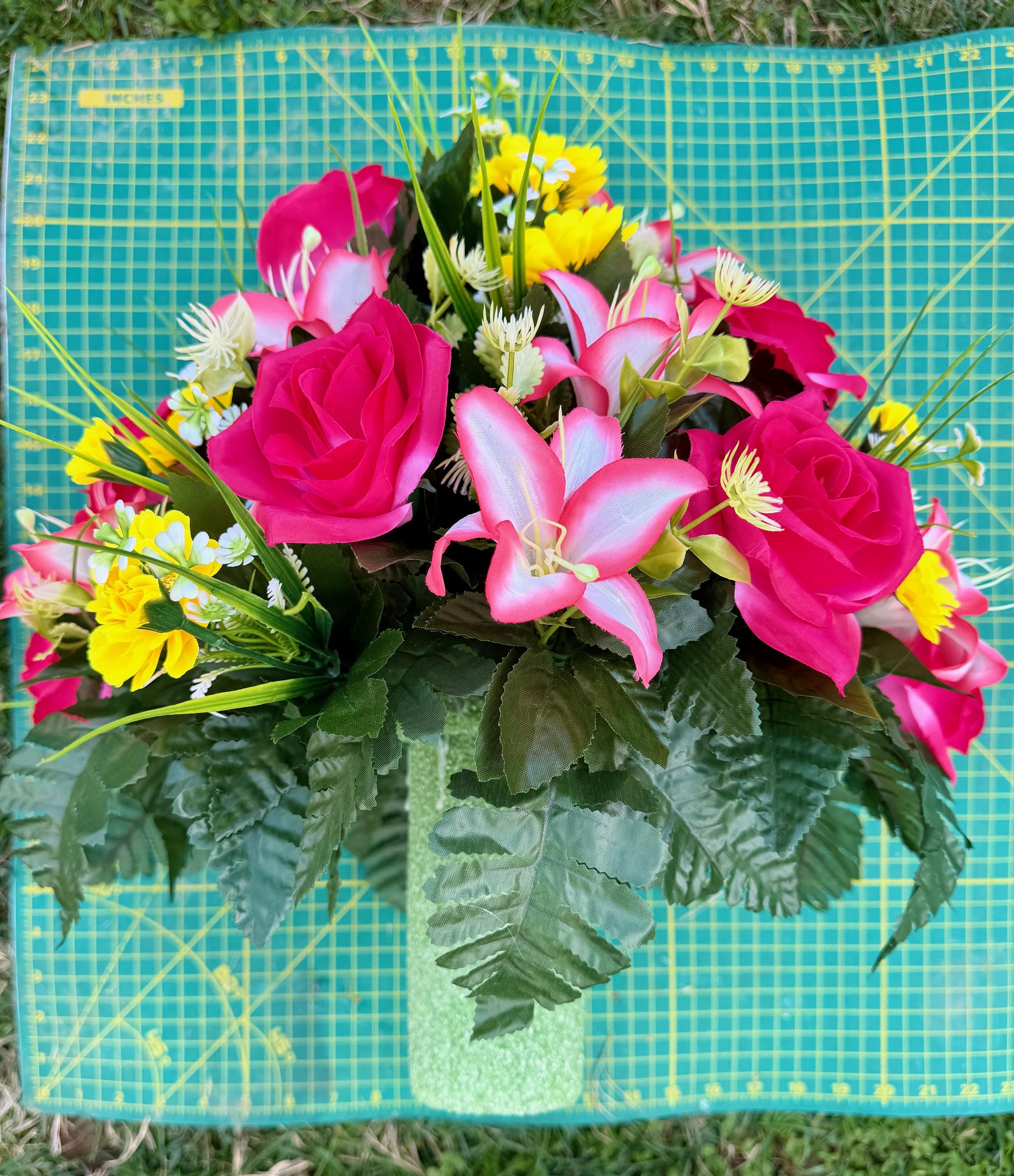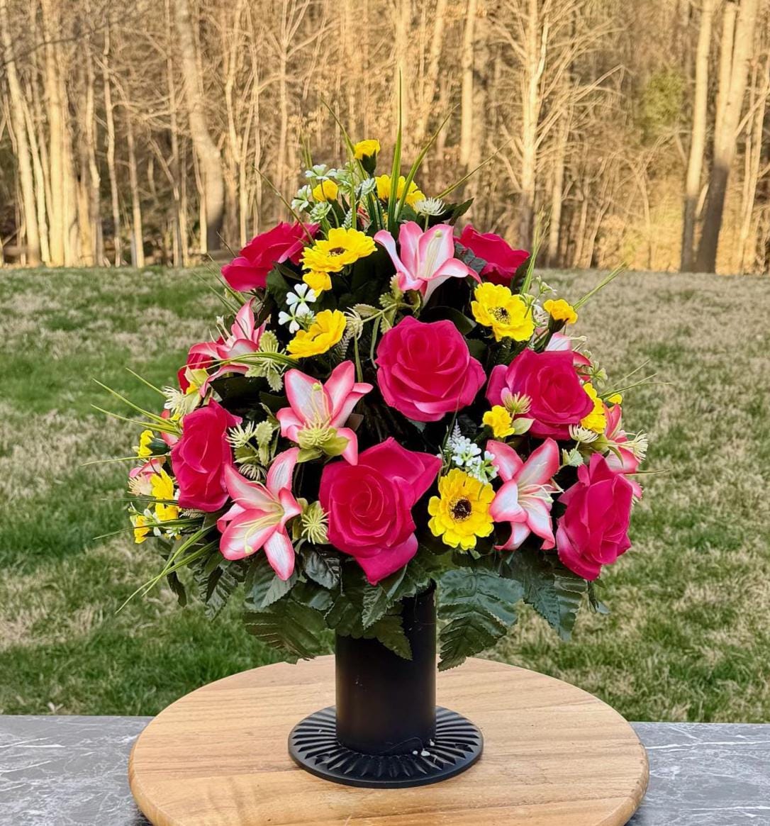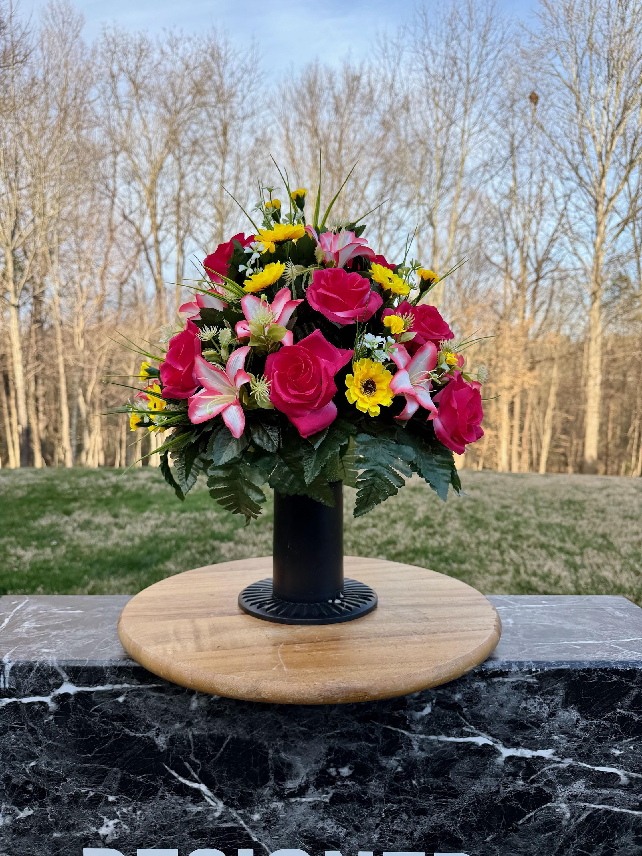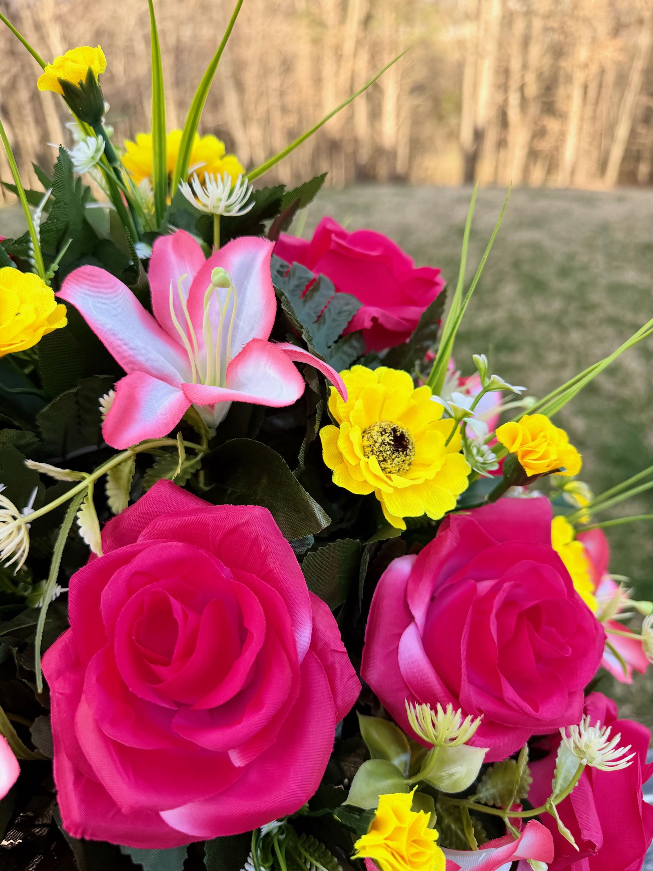 We’re a small, family-operated business consisting of myself, my husband, and my daughter. We personally manage every order and strive for excellent customer service. All our arrangements use high-quality silk flowers, though all silk blooms may fade over time. Each stem is glued into foam to withstand the elements. Designed by M&E uses only premium silks, and we put genuine care into every piece we create. Rest assured, the arrangement shown in our photos is exactly the one you’ll receive, as I design and assemble each one myself. If you’re searching for something unique or have a particular flower, color, or matching vases in mind, please contact me to discuss a custom order.